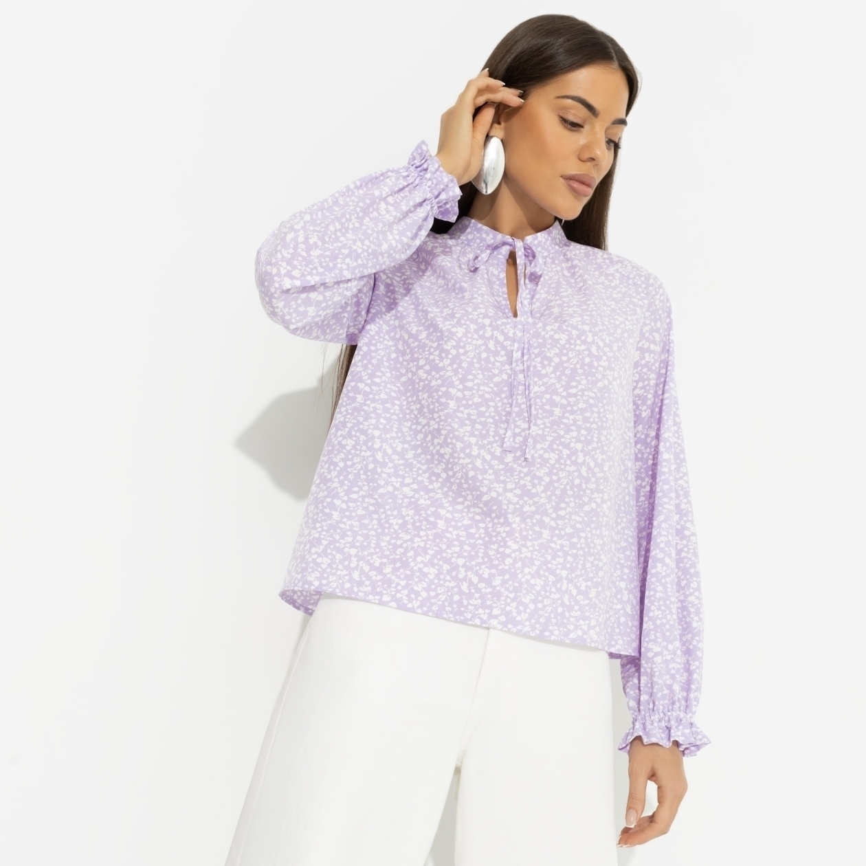 Может ли вещь вызвать мурашки? Может, если речь идет о блузе CHARUTTI в нежном цвете лавандовой жвачки. Именно в ней ты слушала первые признания в любви от него. Воспоминания на всю жизнь. Блуза классического кроя. Деликатный воротник-стойка на тонких завязках. Рукава оформлены рюшами. Блуза хорошо смотрится в заправленном виде и навыпуск.