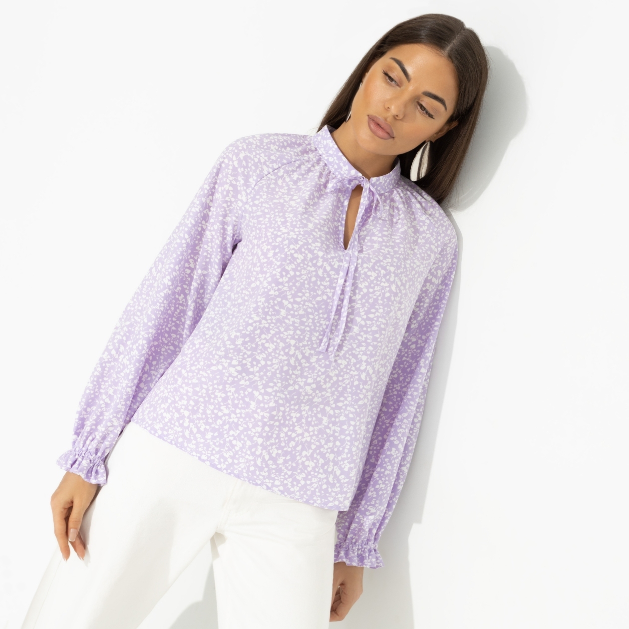 Может ли вещь вызвать мурашки? Может, если речь идет о блузе CHARUTTI в нежном цвете лавандовой жвачки. Именно в ней ты слушала первые признания в любви от него. Воспоминания на всю жизнь. Блуза классического кроя. Деликатный воротник-стойка на тонких завязках. Рукава оформлены рюшами. Блуза хорошо смотрится в заправленном виде и навыпуск.