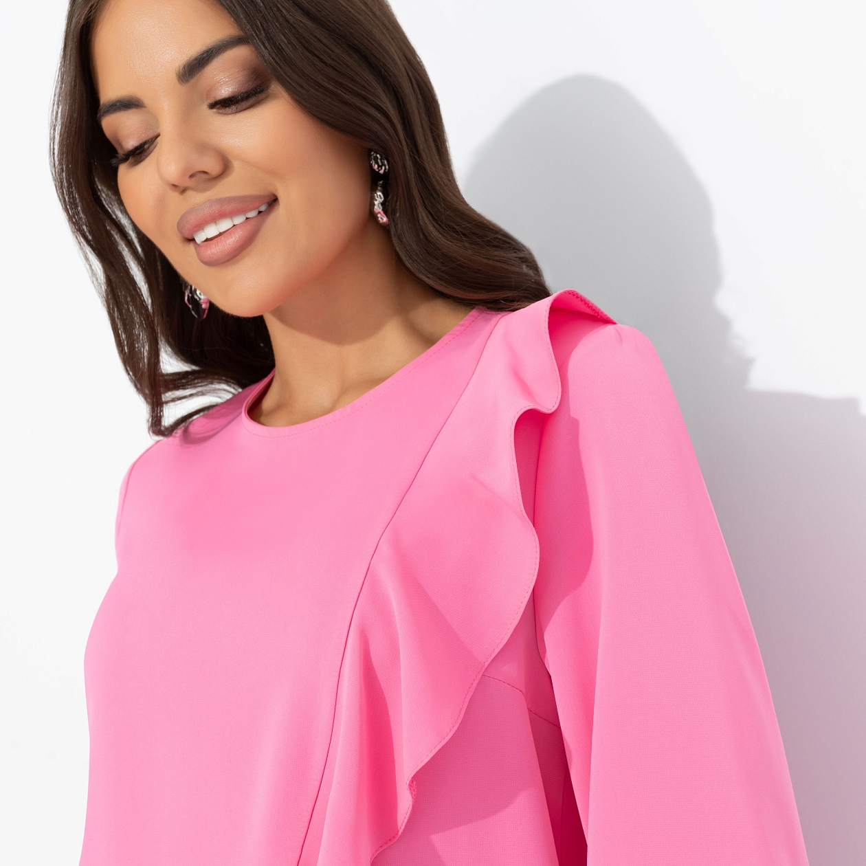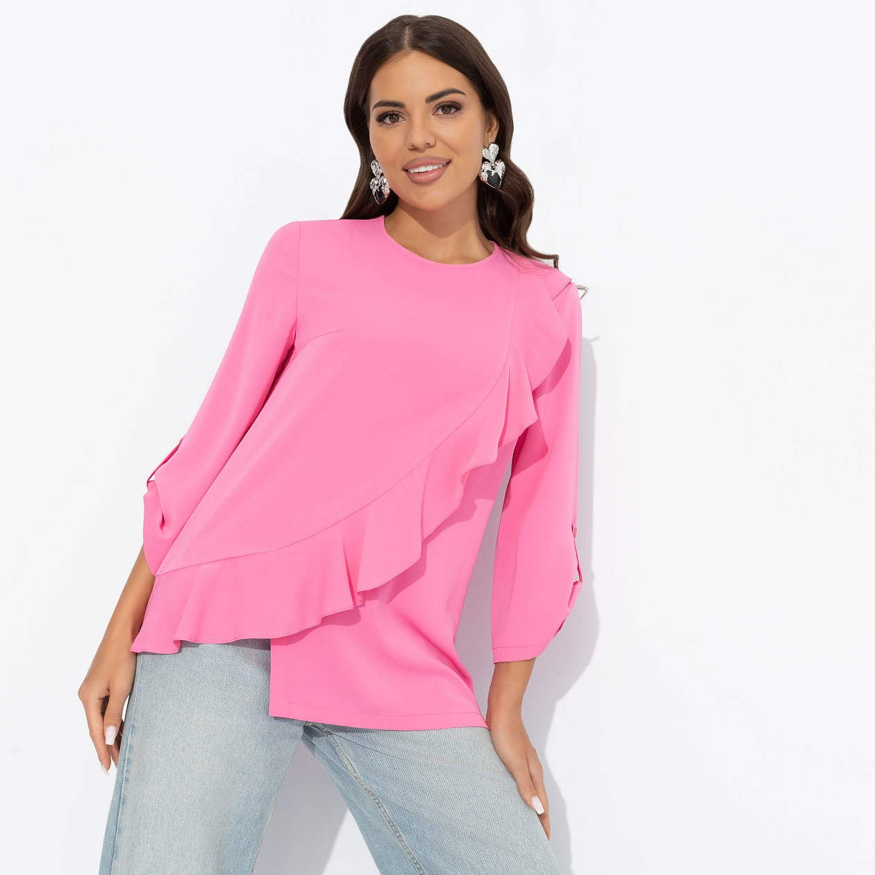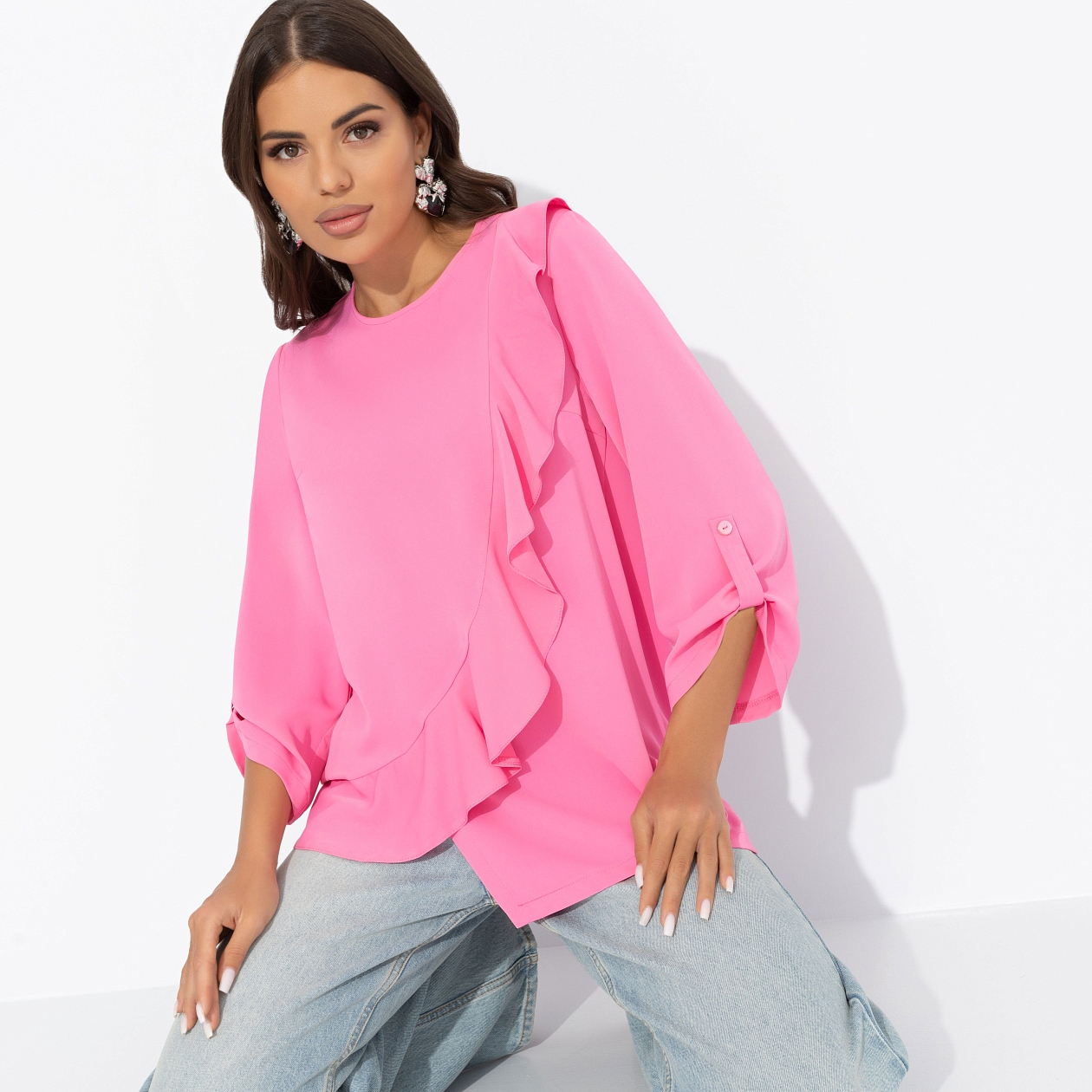 Настроение – pink. Клубничные макарун на завтрак, пара входящих признаний любви в мессенджере и блуза от CHARUTTI. Любовь к жизни буквально в каждом движении. Блуза имитирует запах. Объемный декор по передней части изделия. Рукава три четверти с подхватом на пуговицы.