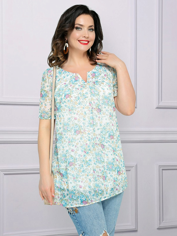Нежная блузка в мелкий цветочек сделана из легкого шифона. Трикотажный подклад. Красивый воротник-лодочка подчеркивает изящную линию плеча и удлиняет шею. Классный вариант на лето!