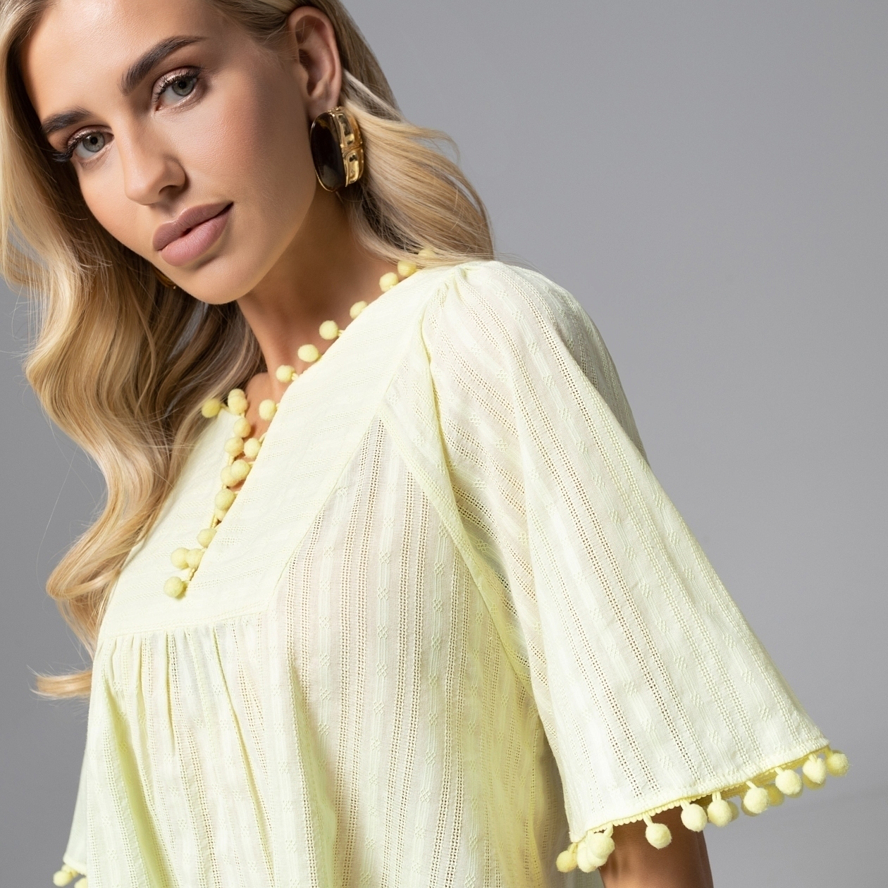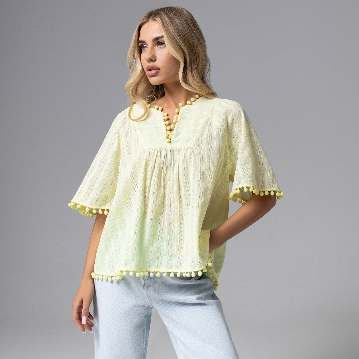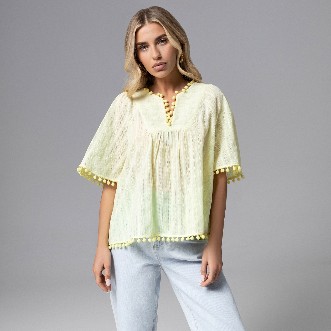Каникулы в Каннах подтверждены. Блуза из хлопка премиального качества готова к путешествию. Миниатюрные помпоны уже мысленно игриво покачиваются во время прогулки вдоль моря. А вы уже чувствуете запах свежеиспеченного хлеба с томатной сальсой? Блуза свободного кроя в стиле бохо. Хорошо смотрится на любом типе фигуры. Деликатная сборка по передней части изделия.