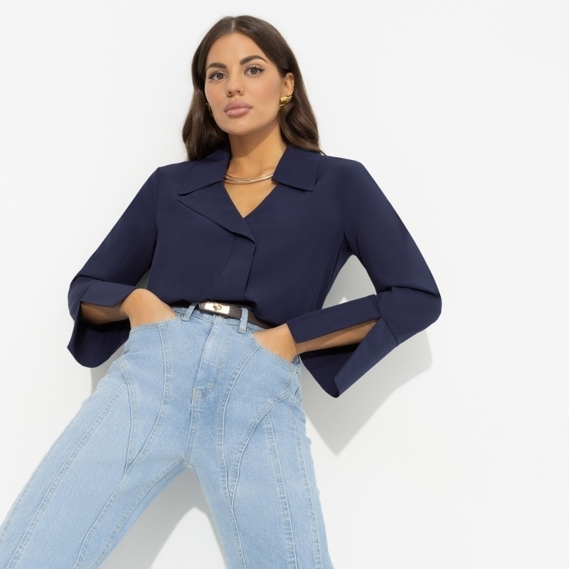 Баланс в жизни выглядит буквально как элегантная блуза глубокого черничного цвета и несколько отвязанных шуток для коллег. За такую редкую гармоничную контрастность тебя любят и ценят. Блуза классического кроя с лацканами. Расклешенный рукав с разрезами. Имитация линии пуговиц. Изделие отлично смотрится в заправленном виде и навыпуск.
