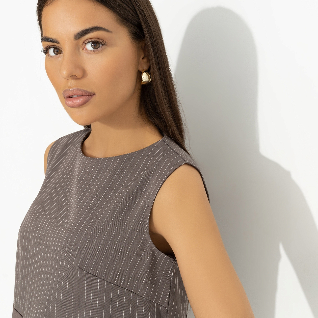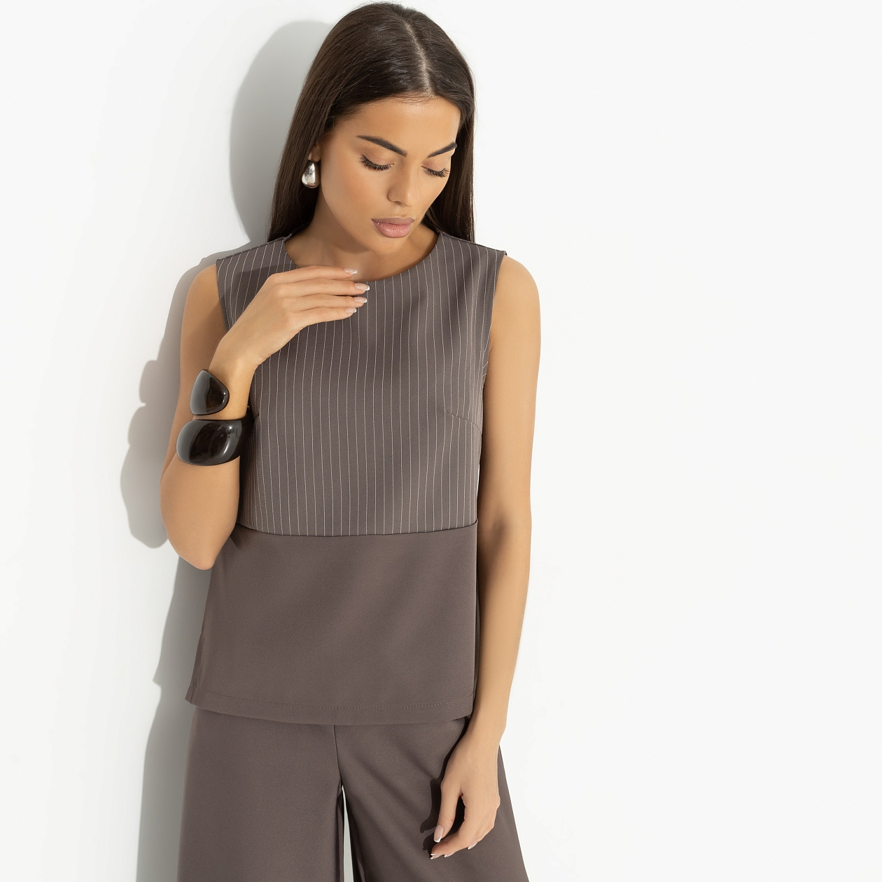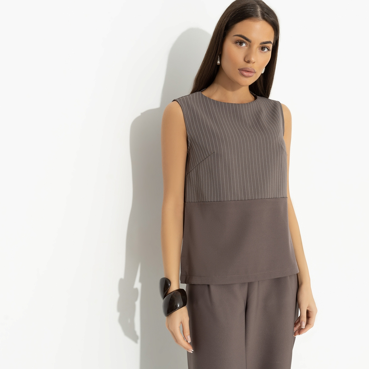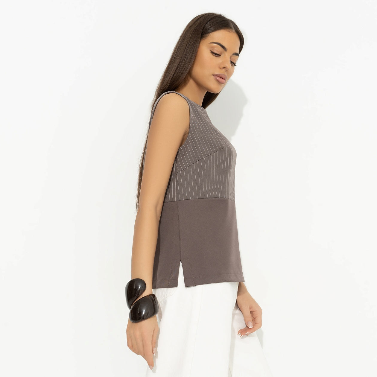 Ты с чашечкой капучино в блузе CHARUTTI цвета капучино встречаешь утром своего кумира. Босс, который должен подписать заявление на твой отпуск, самый лучший человек на свете. На сегодня. Блуза без рукавов. Комбинация двух видов ткани. Хорошо смотрится и как самостоятельный элемент, и в качестве второго слоя. Есть скрытая молния по спинке.