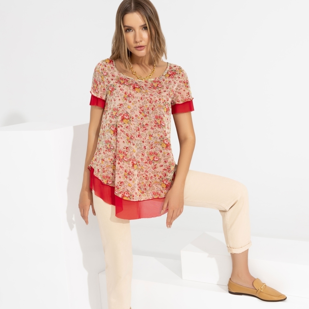 Создайте стильный и яркий образ с блузой «Тандем». Для повседневного стиля сочетайте её с джинсами или юбкой и кроссовками. Для вечернего выхода выберите брюки или юбку-карандаш и туфли на каблуке. Добавьте аксессуары, такие как серьги или браслеты, чтобы подчеркнуть цветочный принт и многослойность блузы. В этом наряде вы будете выглядеть модно и привлекательно в любой ситуации.
