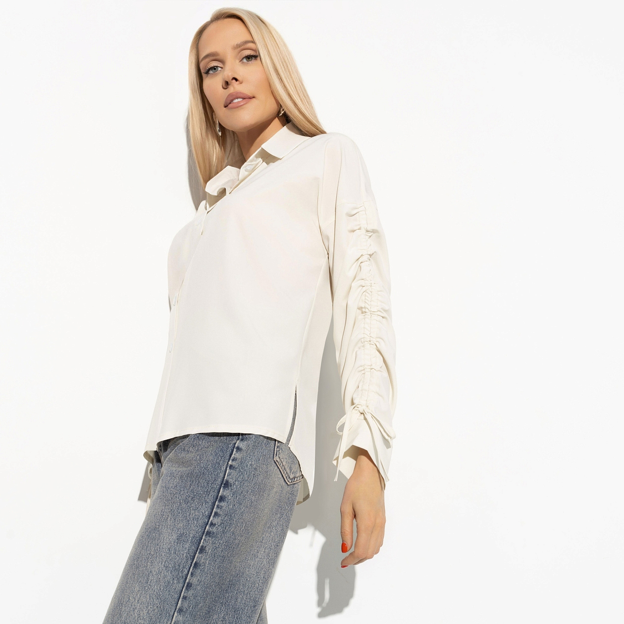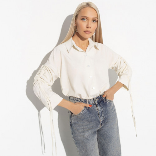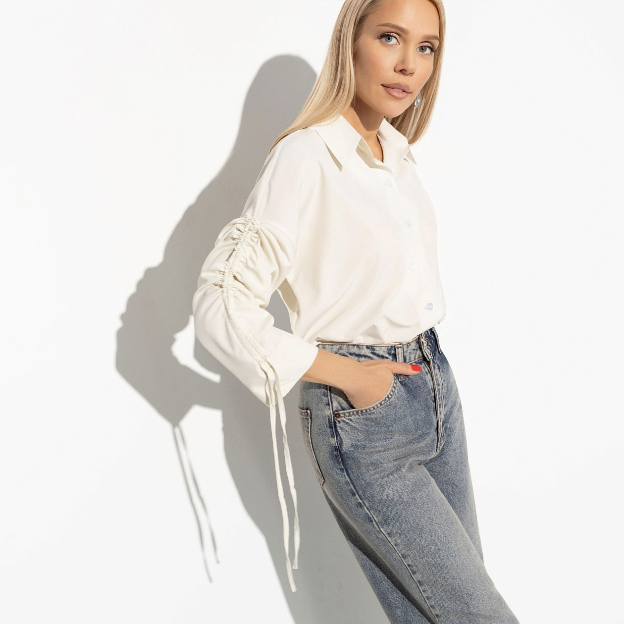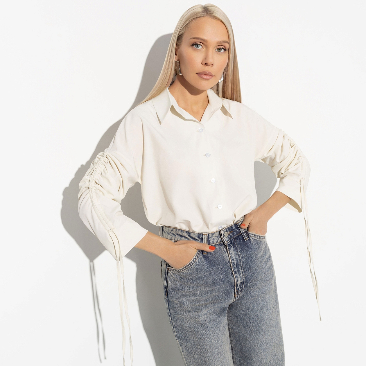 Стиль «гламур» в своих истоках был наделен долей хулиганства. Так женственность и дерзость стали идти рука об руку. В блузе с собранными рукавами есть щепотка экстравагантности при общей элегантности образа. Блуза свободного кроя. Чуть спущенная линия рукава. Регулируемая сборка на рукавах. Деликатные разрезы по бокам изделия.