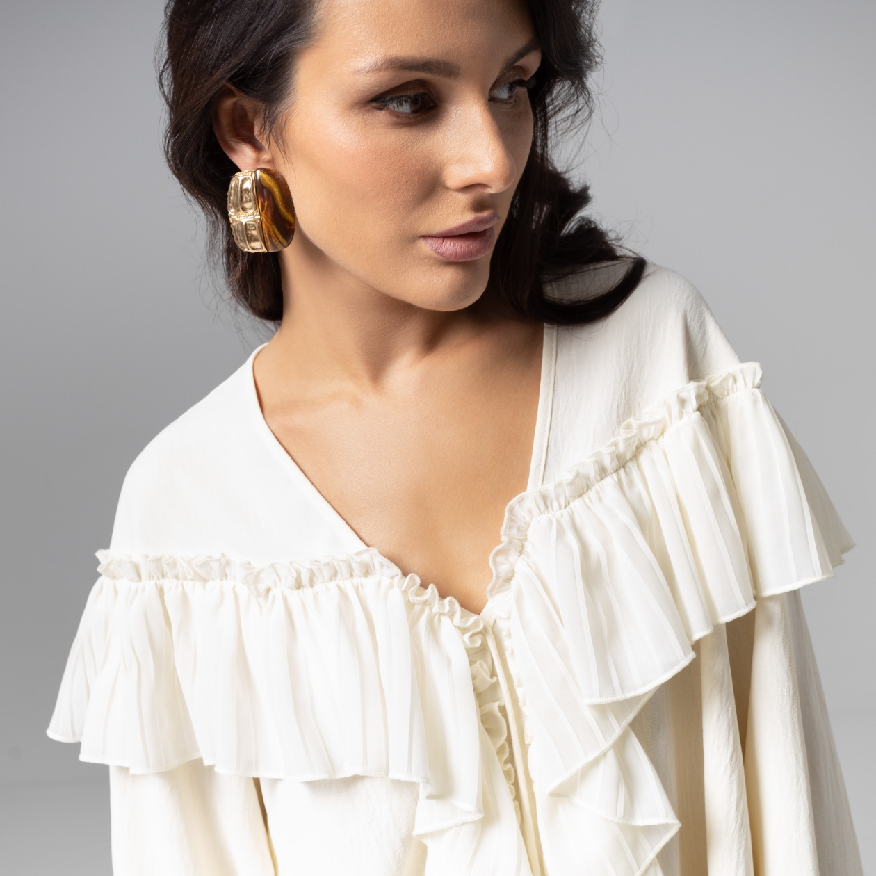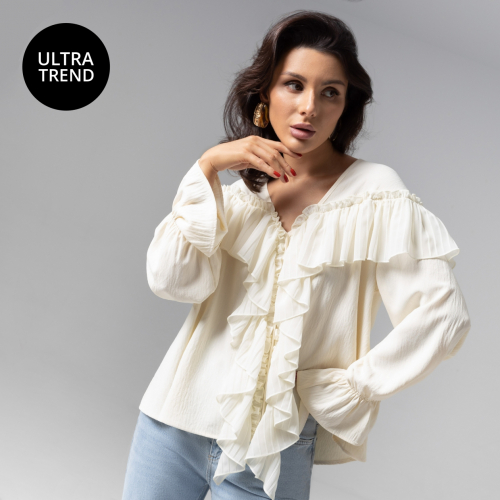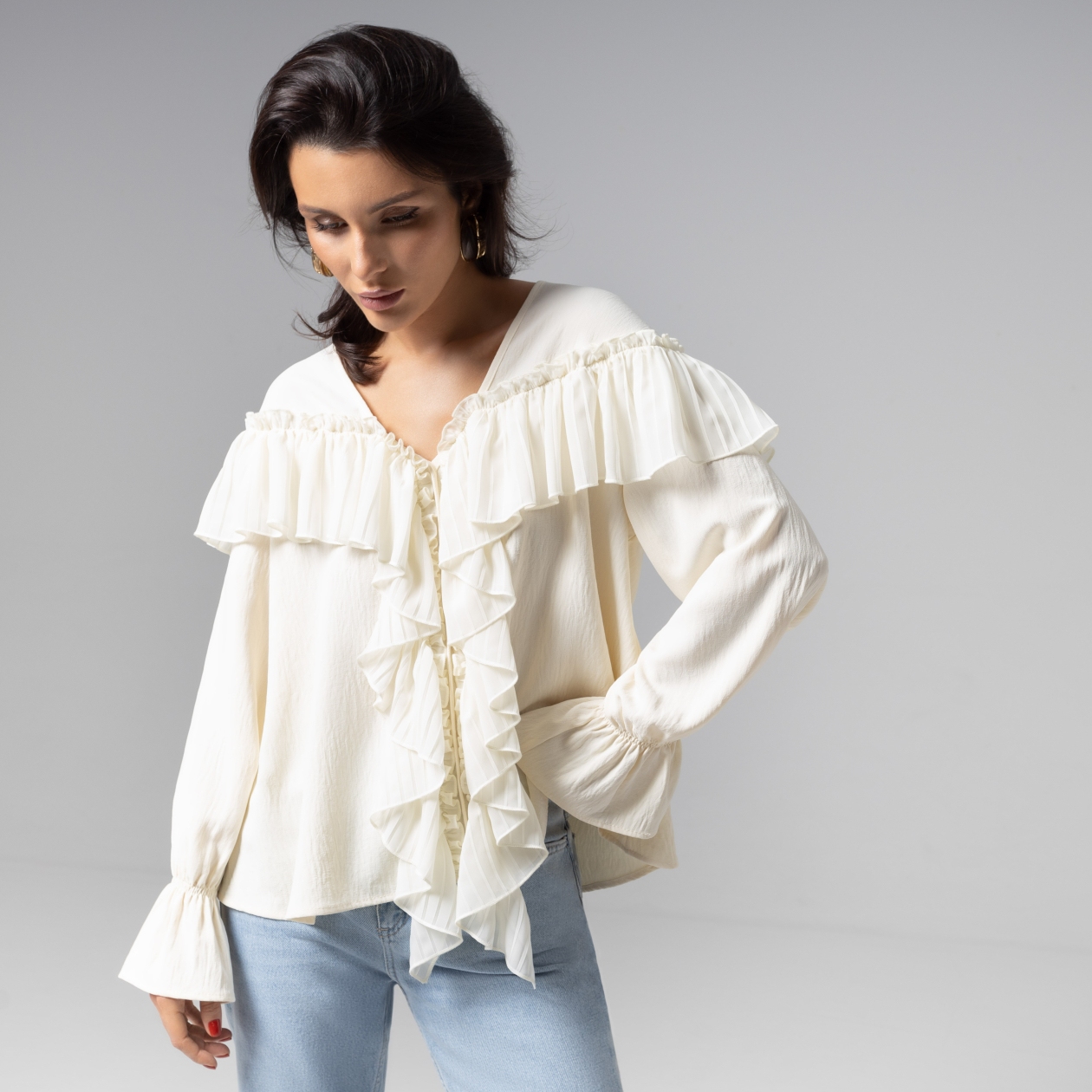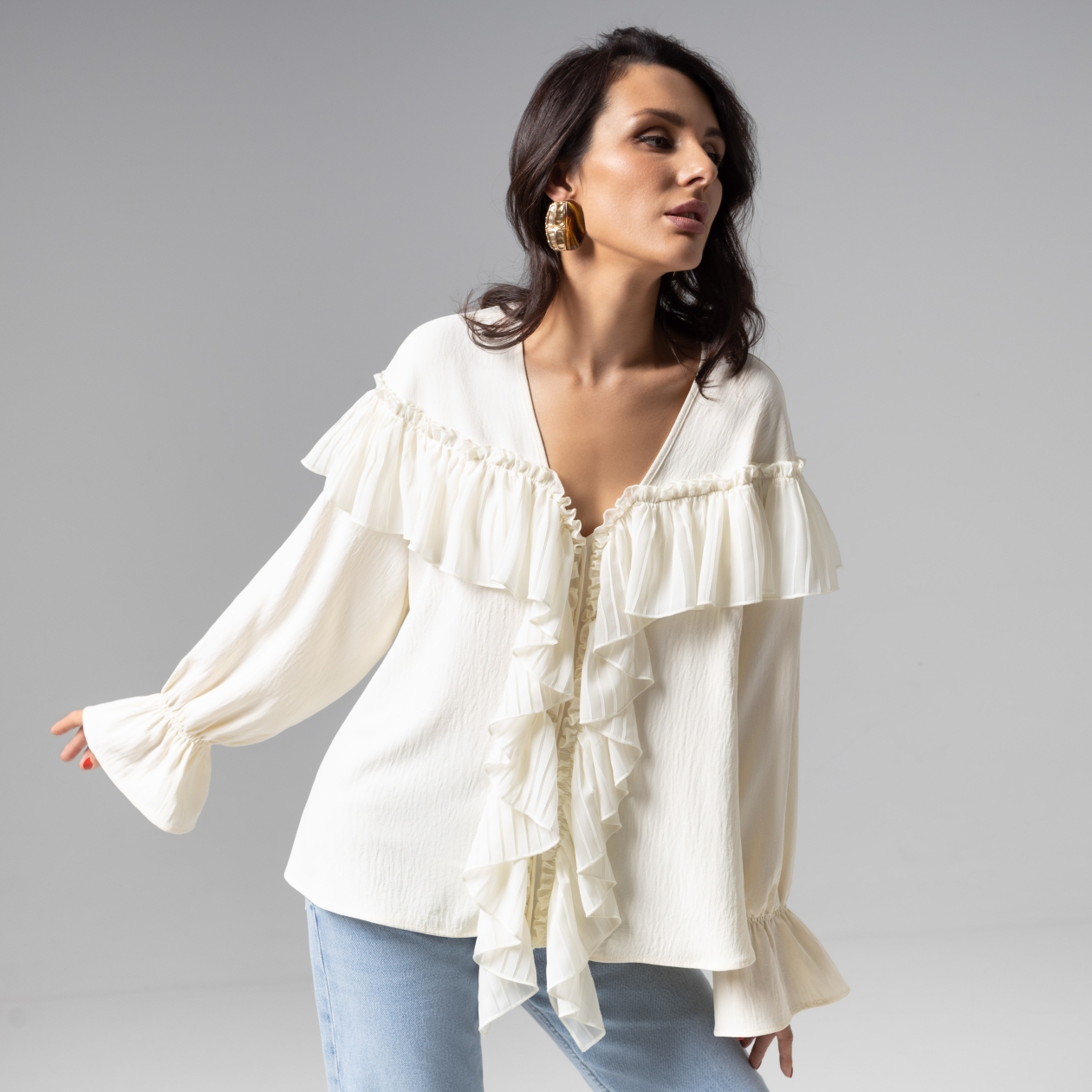 Блуза ЧАРУТТИ в стиле бохо с воланами – воплощение утонченной элегантности. Изысканный силуэт с мягким объемным кроем создает ощущение легкости, благодаря продуманной конструкции плечевых линий. Романтичные рюши обрамляют линию горловины и манжеты, добавляя образу игривую динамику. Ткань премиального качества обладает фактурой и практичностью: не мнется даже после длительного ношения. Деликатные закрытые швы подчеркивают безупречное качество исполнения. Свободный крой позволяет носить блузу как в заправленном виде, так и небрежно выпущенной поверх.