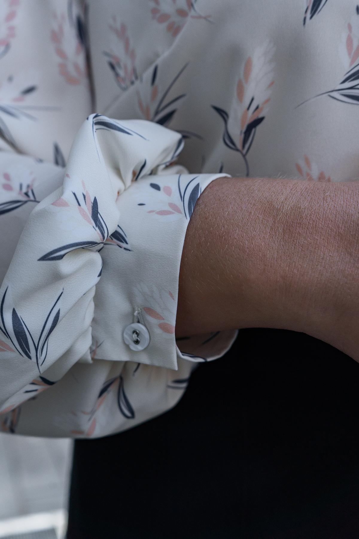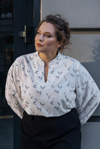Описание: Свежее прочтение классической блузки- V-образный вырез со стойкой вытягивает шею, длинный пышный рукав на манжетах регулируется по ширине благодаря пуговке.