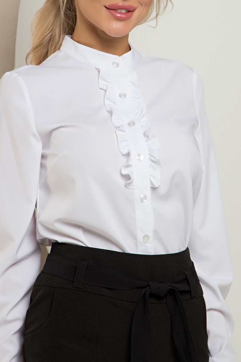 Женственная блуза прямого силуэта из нежной  блузочной ткани. Длинные втачные рукава заканчиваются манжетами на пуговицах. Горловина дополнена воротником-стойкой, переходящим в планку с застежкой на пуговицы.  По переднему полотнищу – оборки. Низ ровный, по бокам небольшие разрезы. Модель придаст Вашему деловому образу очарования.