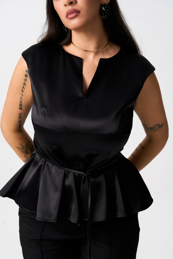 Модель полуприлегающего силуэта. По переду рельефы,переходящие в баску Горловина с V-вырезом. Рукав слегка спущенный. В комплекте тонкий пояс из основного материала.