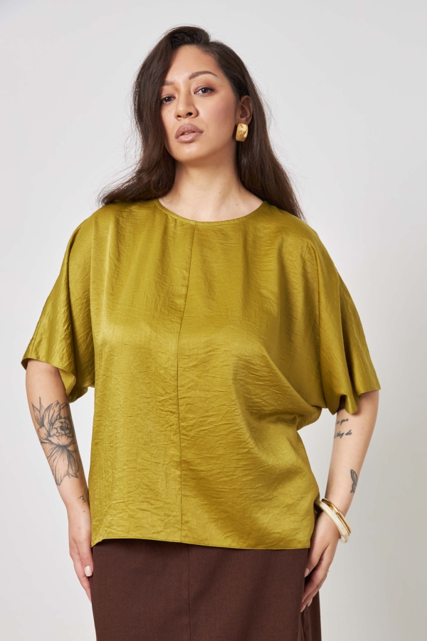Оверсайз блуза из крэш сатина с цельнокроеными рукавами. Перед и спинка со швом посередине, на спинке застежка на пуговицу.