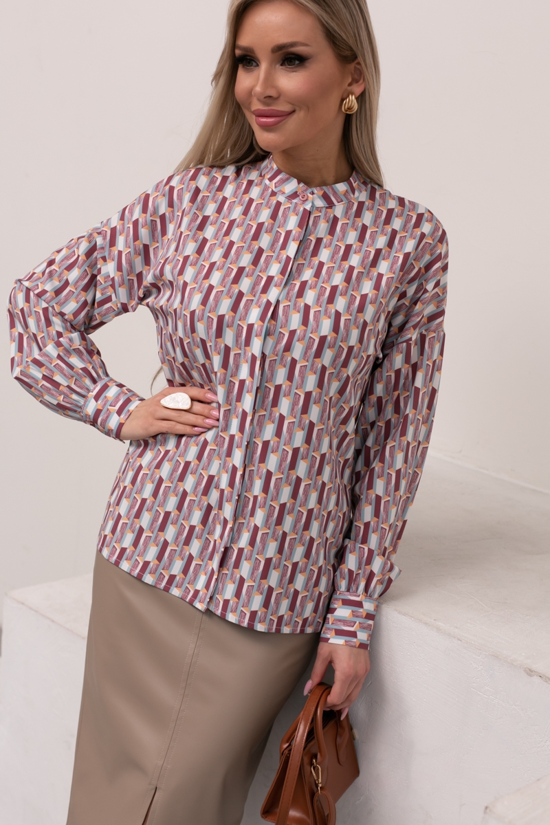 Элегантная блузка прямого кроя из легкой ткани "Ниагара". Плечо спущенное, длинный рукав оканчивается притачной манжетой. Горловина оформлена воротником - стойкой, переходящим в планку с "супатной" застежкой. Низ ровный, без разрезов. Идеальная основа для создания образа.