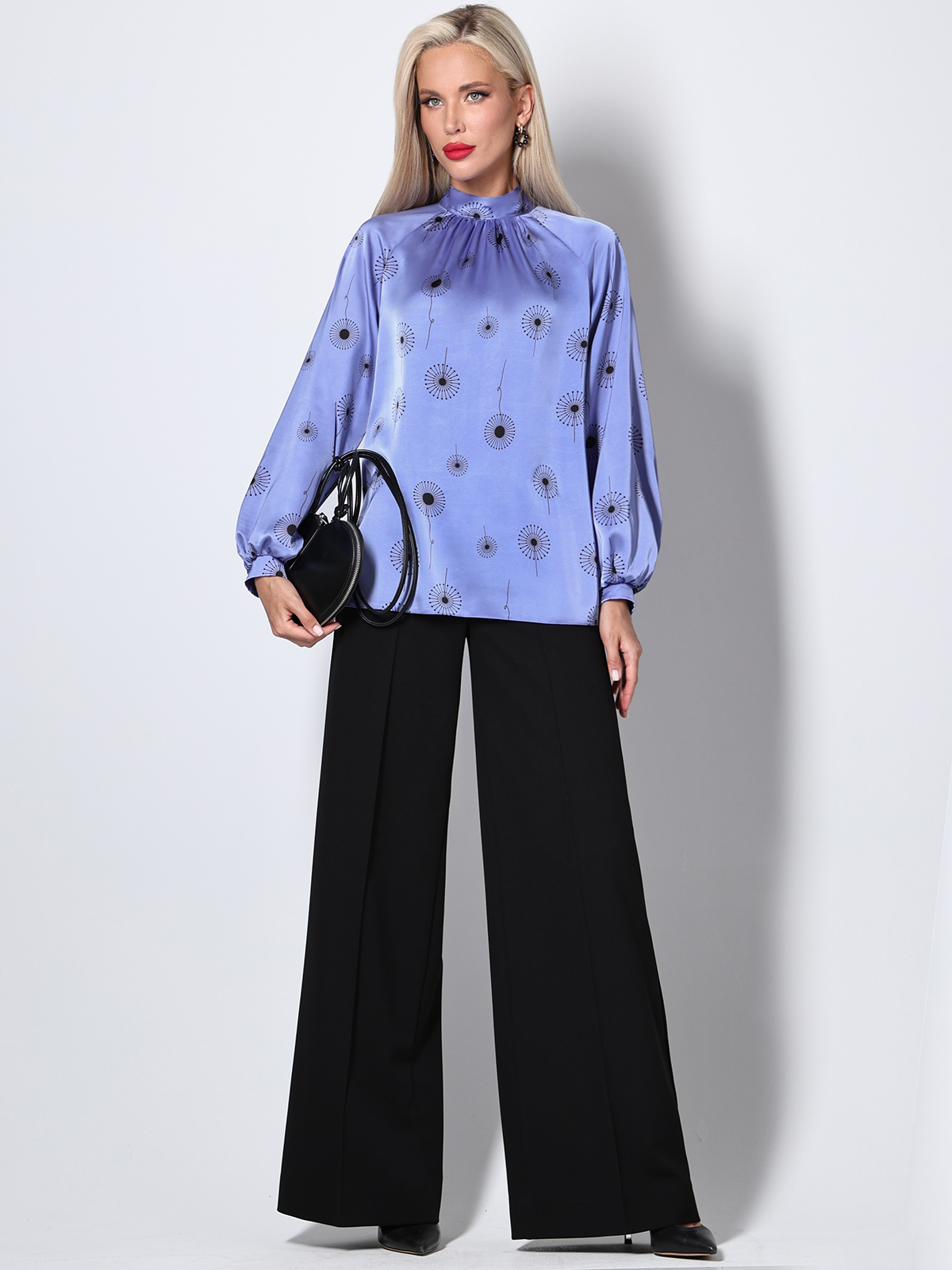 Нежная женственная блузка выглядит всегда торжественно и принесет в ваш повседневный гардероб атмосферу праздника. Воротник-стойка завязывается сзади на бант, что придает образу романтичности, как и объемные рукава. Такая блузка будет смотреться одинаково выигрышно и с юбками, и с брюками, но особенно эффектно сочетается с классической юбкой-карандаш в тон, создавая впечатление коктейльного платья.
