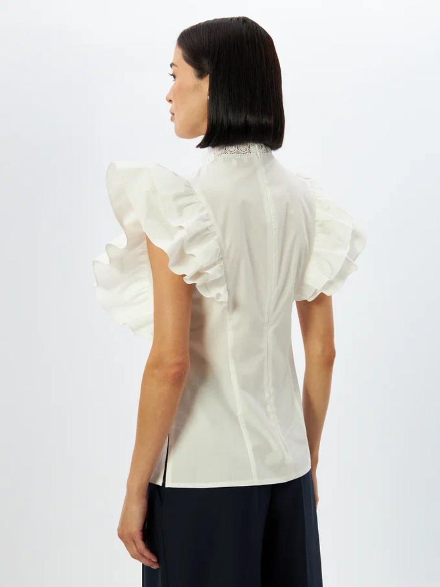 Блузка из однотонного хлопка. Воротник-стойка из кружева. Рукав-крыло 2 рюши в рельефах. Полуприлегающего силуэта. Отделка из кружева по центру полочки. Разрезы в боковых швах изделия. Застежка на потайную молнию в центральном шве спинки. Рост модели 170 см. Изделие на модели 42 р-ра. Длина изделия по спинке 64 см.