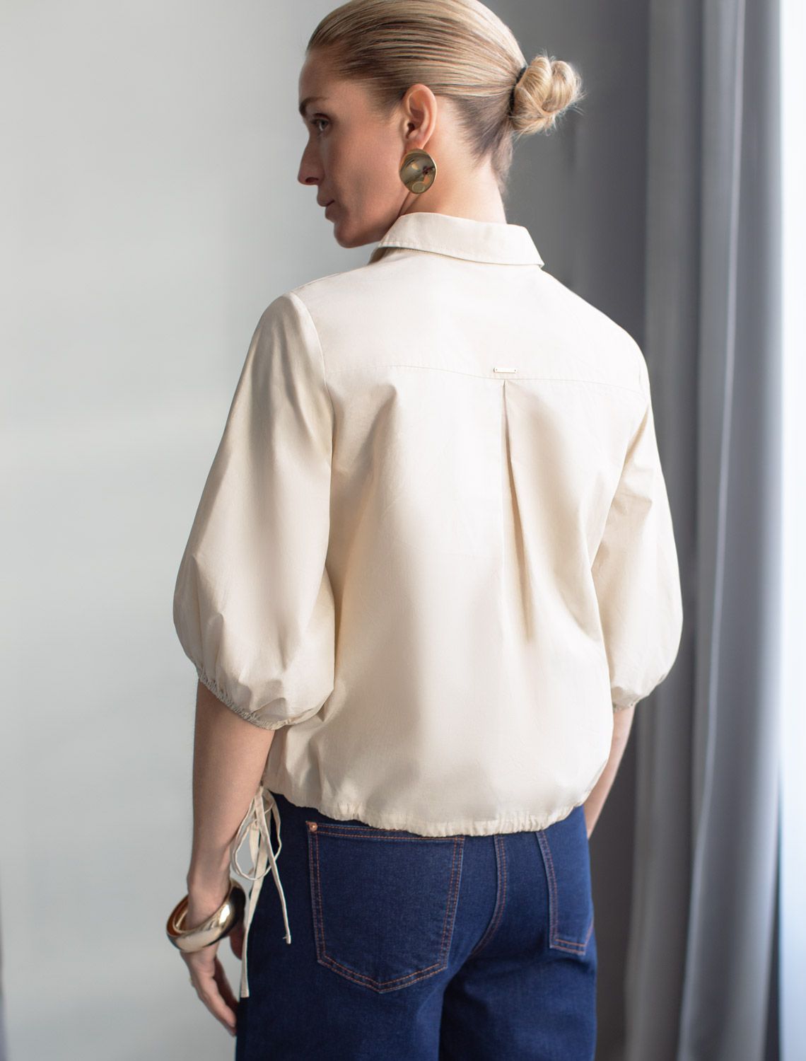 Укороченная блузка с пышными рукавами-фонариками выполнена из легкого хлопкового поплина. Супатная застежка на пуговицы из натурального перламутра. Внизу кулиса с лентами из основного полотна. В изделии будет комфортно, даже в самое жаркое время года. Подходит для любой фигуры. Сочетается в костюме с кюлотами D24.233 и юбкой D26.179