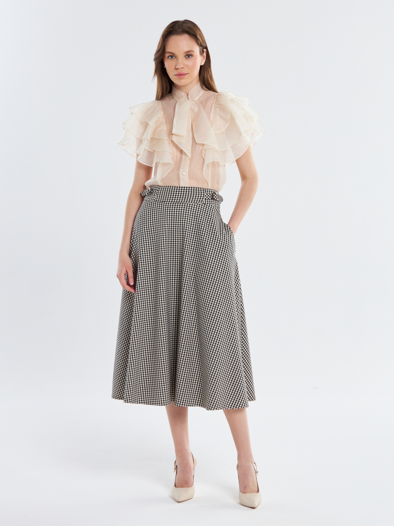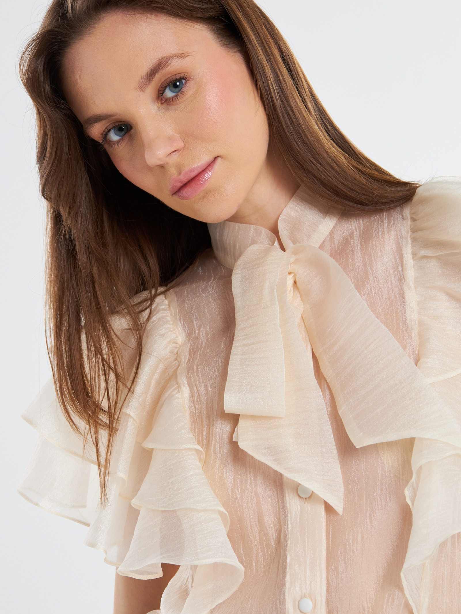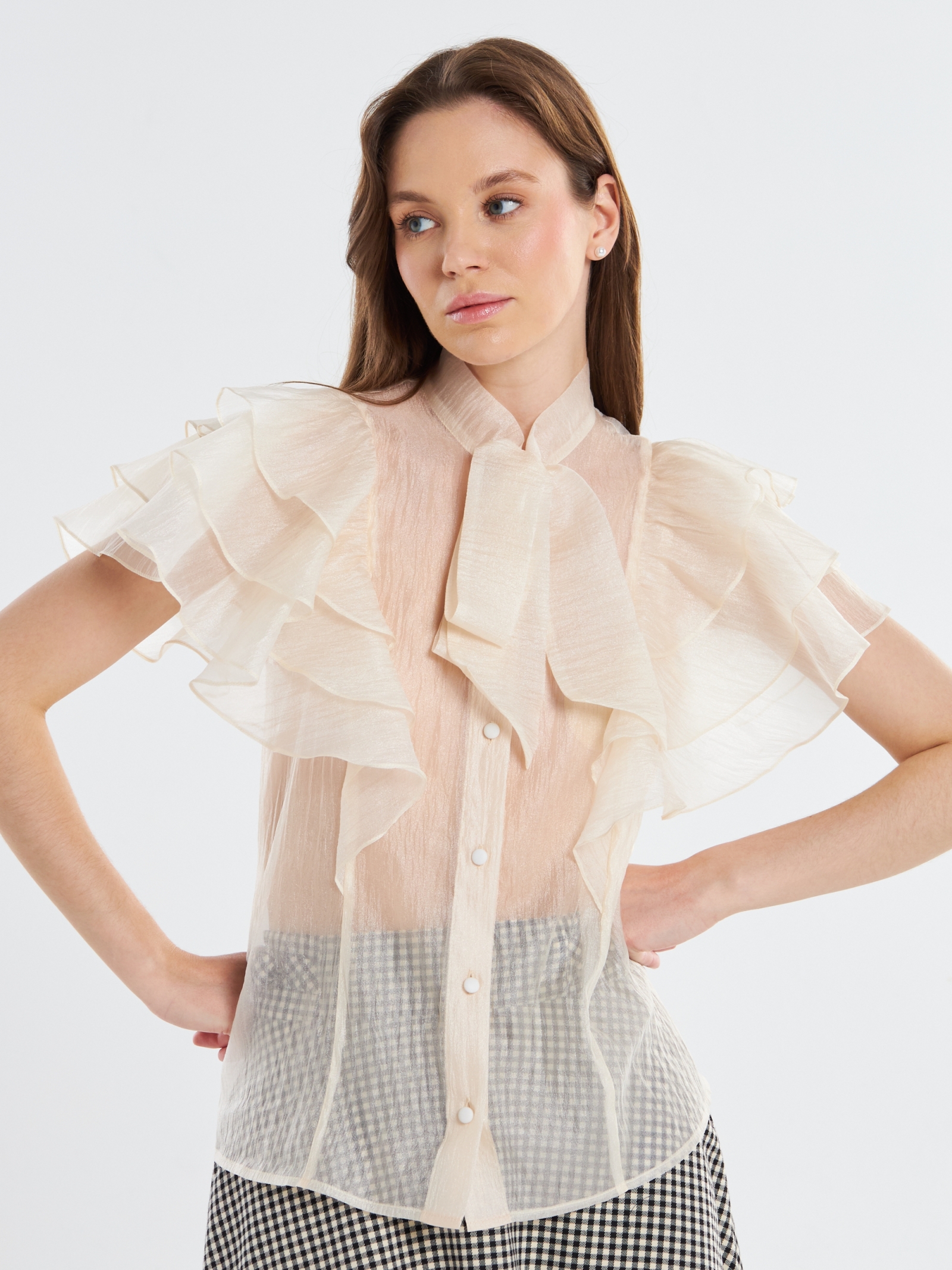Блузка из органзы. Прямой силуэт. Воротник-стойка переходящий в завязки. Рукав крылышко со сборкой, ярусный, уходящий в рельеф. Застежка на планке по центру полочки на петли и пуговицы. Рост модели 170 см. Изделие на модели 42 р-ра. Длина изделия по спинке 60 см.
