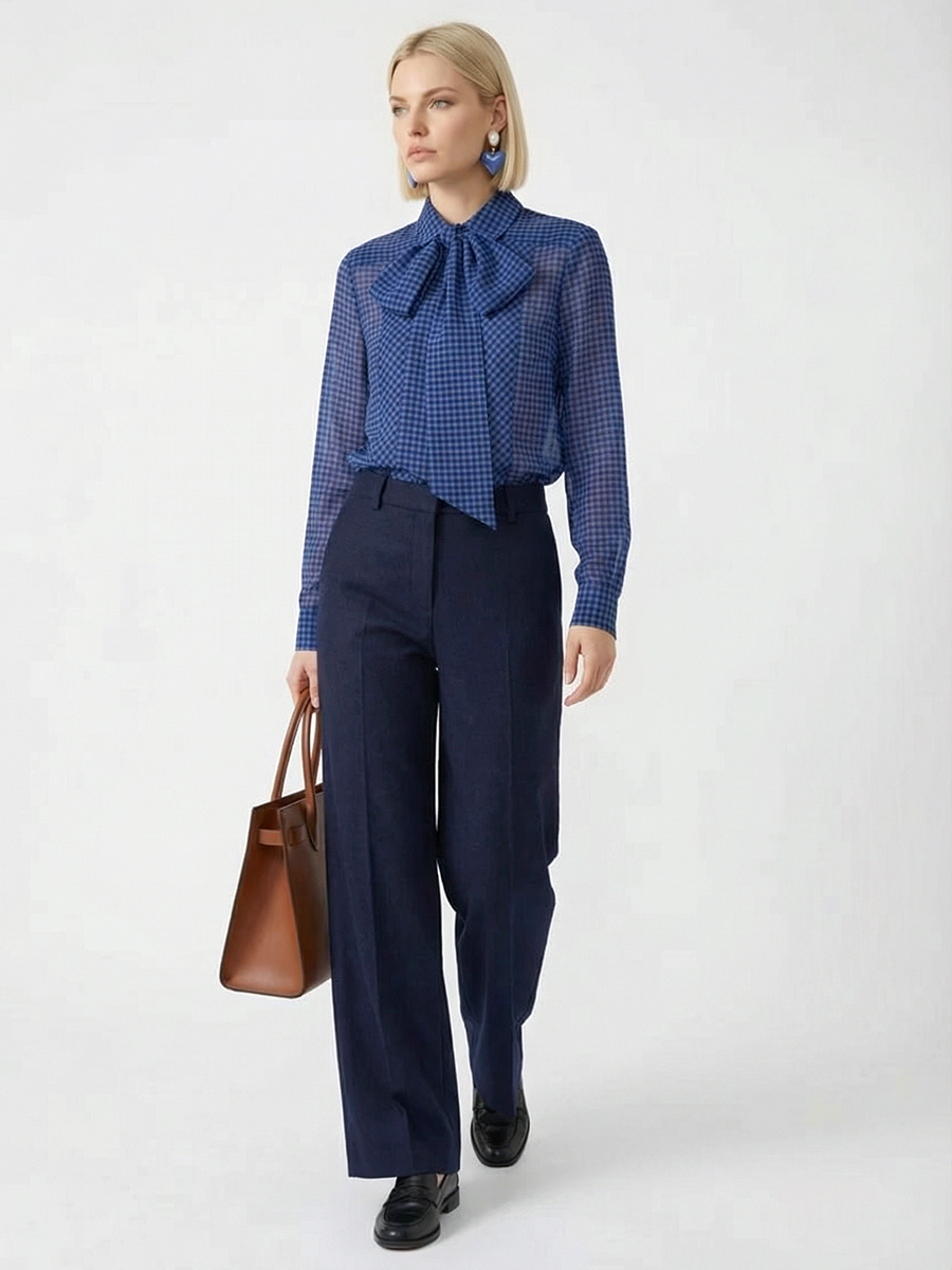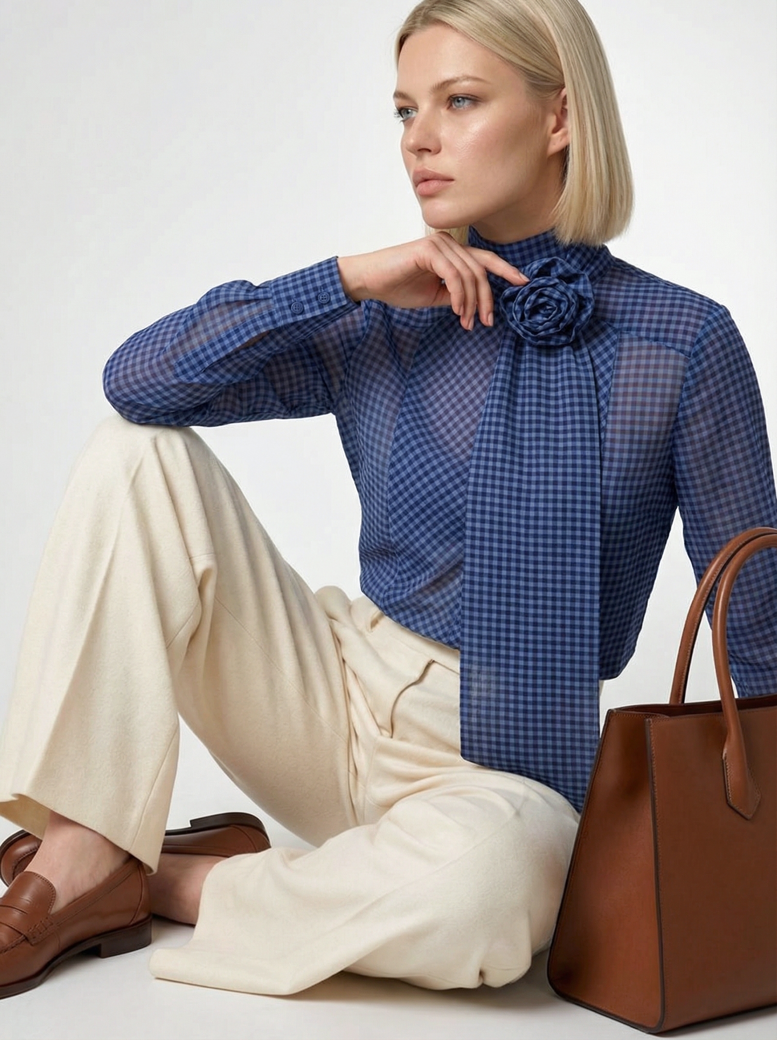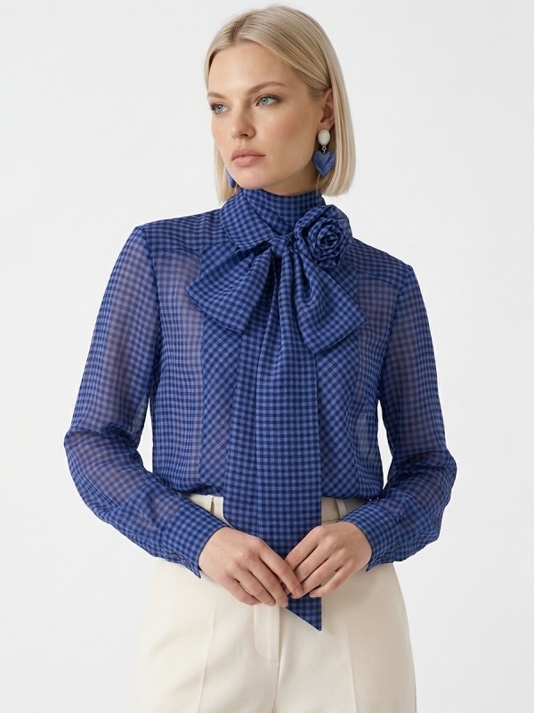 Блузка из легкой органзы в клетку прямого силуэта. Классический рубашечный воротник на стойке с планкой. Рукав втачной, длинный, на манжете. На полочке предусмотрены рельефы. В качестве декоративных элементов выступают съемная роза-брошь и съемная завязка-бант, выполненные из основной ткани. Застежка на петли и пуговицы. Рост модели на фото 170 см, на ней изделие 42 размера. Длина изделия по спинке составляет 63 см. Рекомендуется деликатная стирка при 30 градусах.
