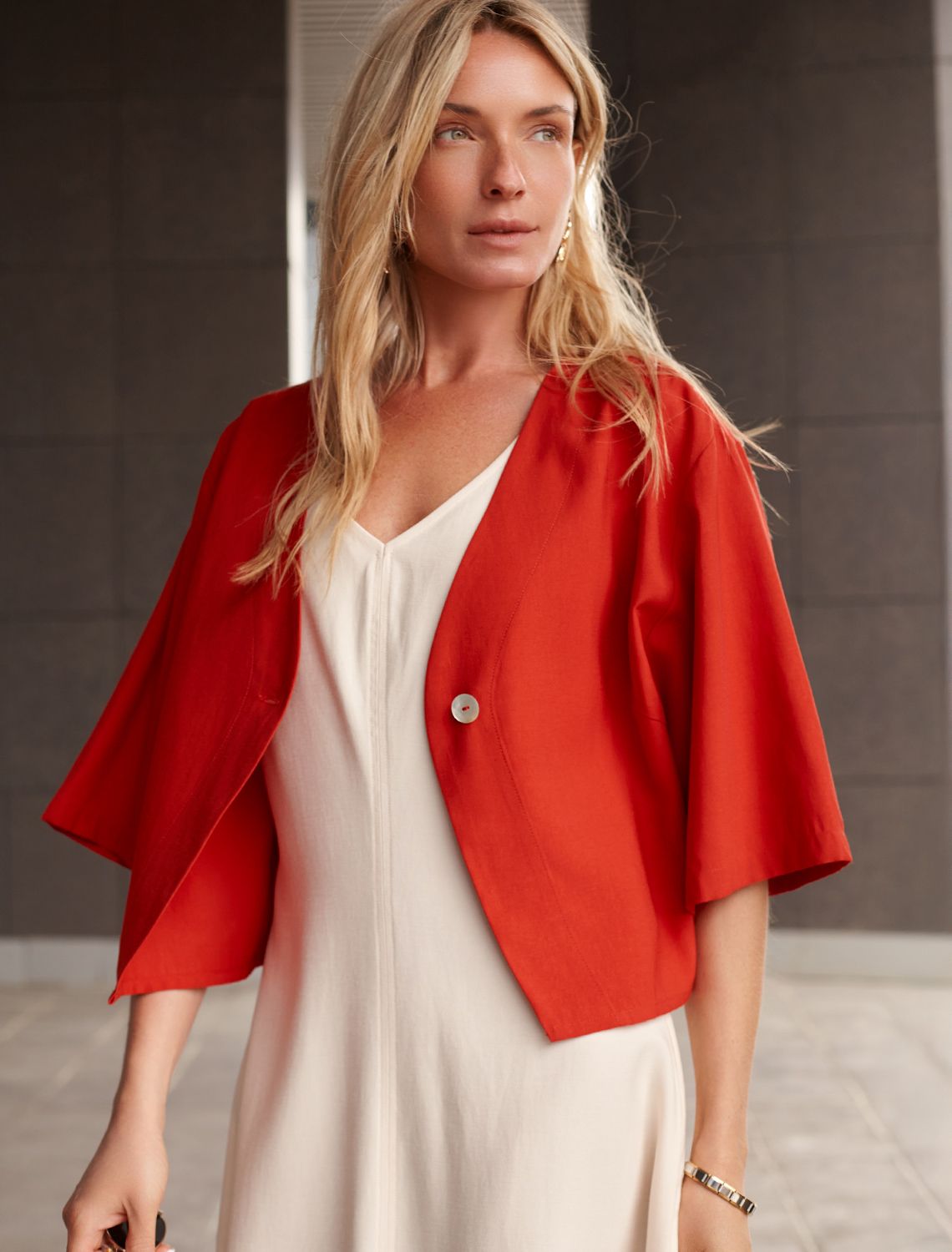 Блузка свободного кроя в стиле кимоно выполнена из плотного лиоцелла. Модель со спущенным плечом и застежкой на одну пуговицу. Ткань изделия отлично держит форму, плавно драпируется и не просвечивает. В теплое время года приятно охлаждает кожу. Добавление синтетических волокон в составе изделия, предотвращает сминаемостьи поддерживает формоустойчивость. Блузка сочетается в костюме с брюками D24.261, D24.265, D24.267, шортами D28.057 и юбкой D24.261, а также очень эффектно с белыми шортами и джинсами.