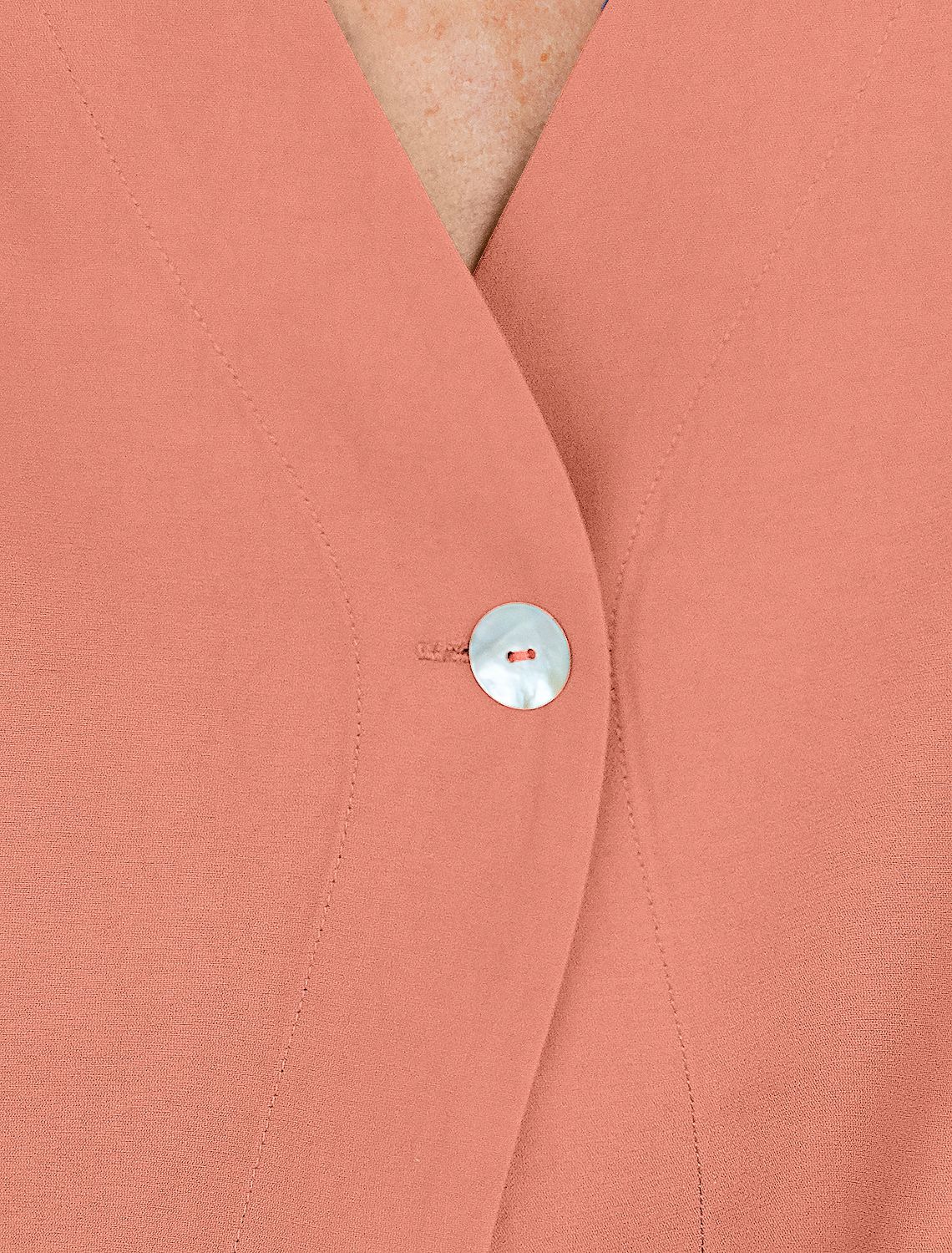 Блузка свободного кроя в стиле кимоно выполнена из плотного лиоцелла. Модель со спущенным плечом и застежкой на одну пуговицу. Ткань изделия отлично держит форму, плавно драпируется и не просвечивает. В теплое время года приятно охлаждает кожу. Добавление синтетических волокон в составе изделия, предотвращает сминаемостьи поддерживает формоустойчивость. Блузка сочетается в костюме с брюками D24.261, D24.265, D24.267, шортами D28.057 и юбкой D24.261, а также очень эффектно с белыми шортами и джинсами.