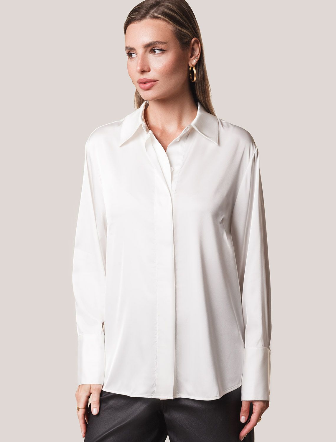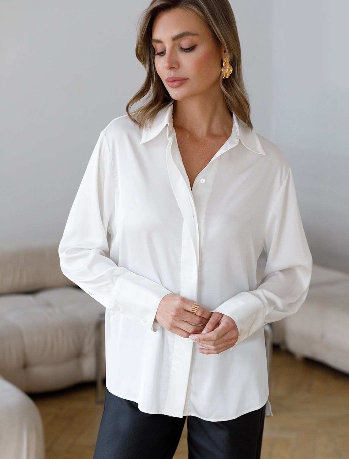 Сатиновая блузка с эластаном натруального белого цвета – воплощение элегантности и комфорта. Благородный блеск сатина добавляет образу шика, а эластичность материала гарантирует удобство при носке. Прямой силуэт блузки обеспечивает комфорт, а эластичность материала предотвращает деформацию. Застежка-планка с потайными пуговицами придает модели аккуратность. Универсальный вариант для casual-образов. 94%ПЭ 6%ПУ
