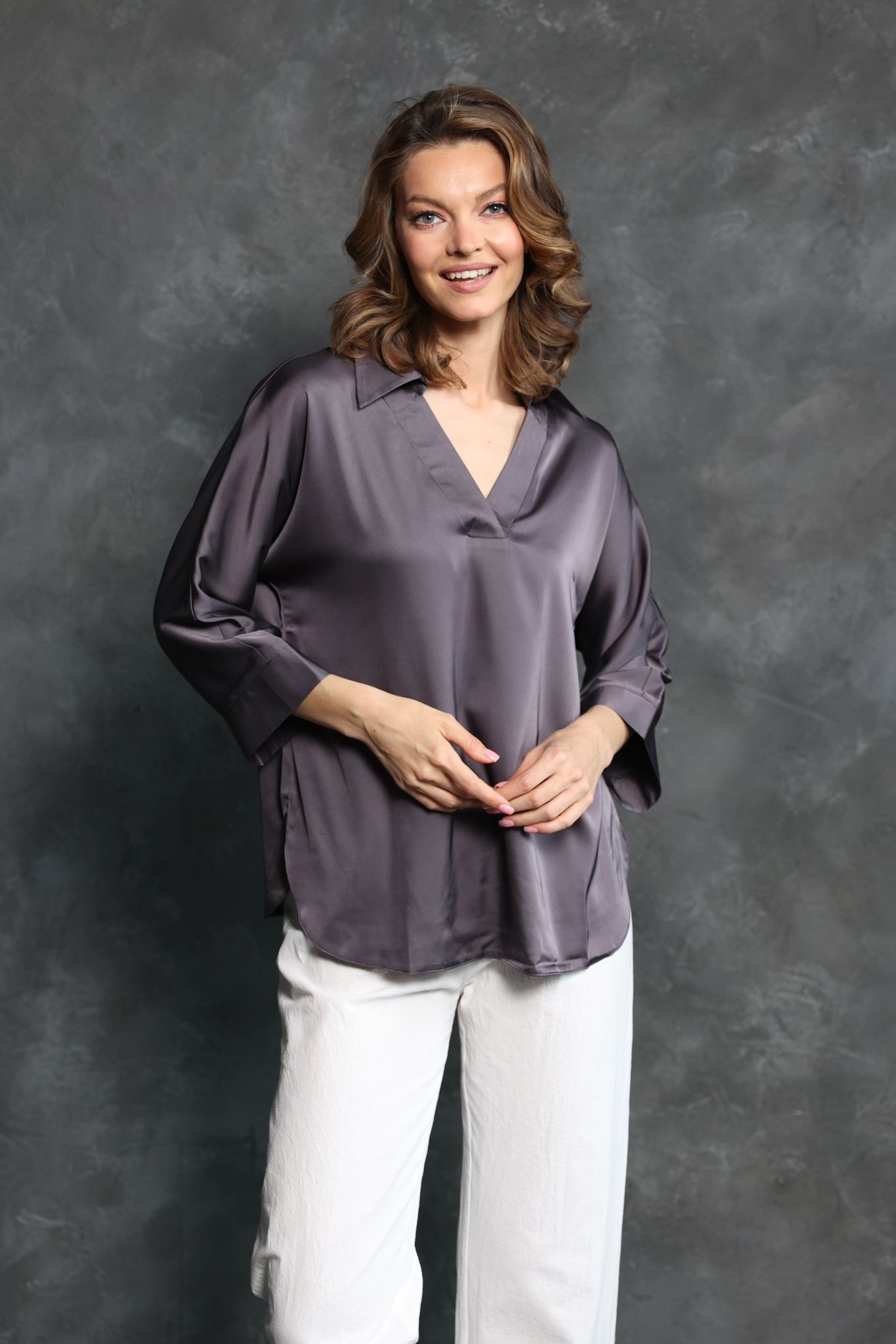 Блузка прямого кроя с полукруглым низом. Ворот с V-вырезом и отложным воротом. Широкий, втачной рукав длиной 7/8 с манжетой.