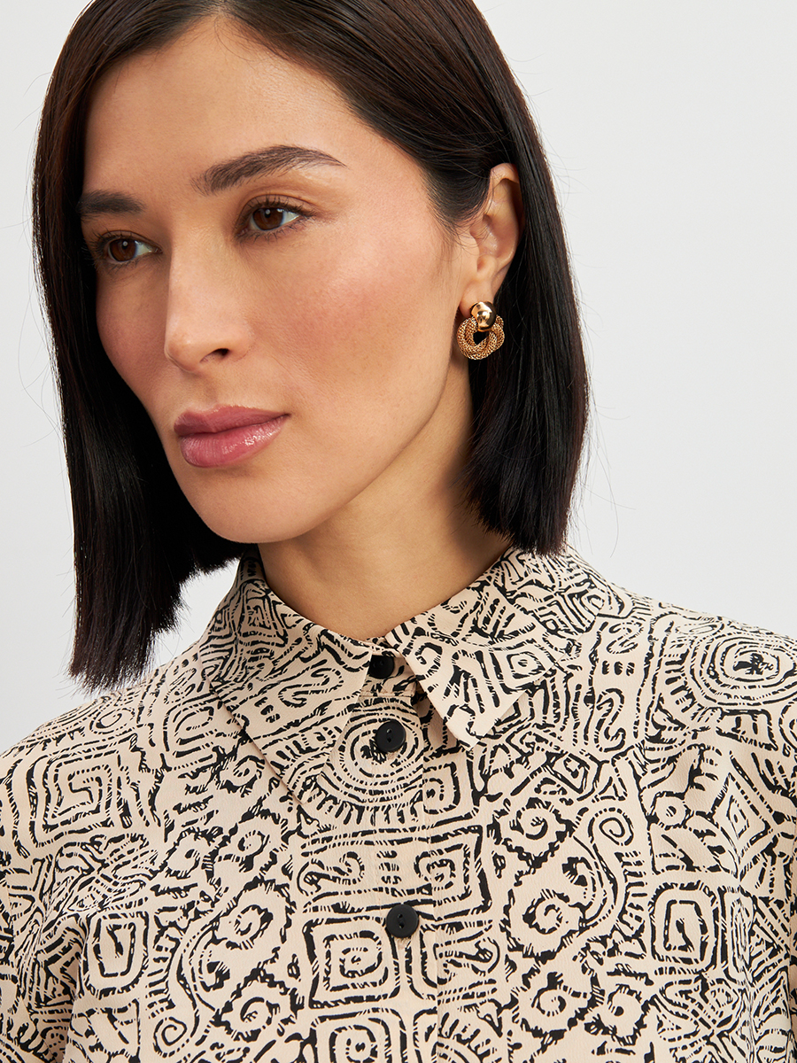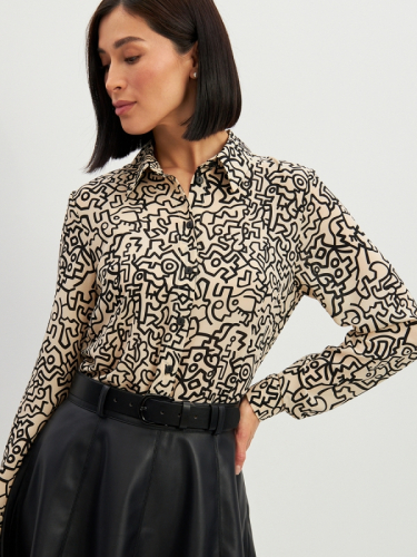 Блузка из принтованной атласной и ткани шифон. Прямого силуэта. Рубашечный воротник на стойке с планкой. Рукав втачной длинный на манжете. Застежка на петли и пуговицы.Рост модели 170 см. Изделие на модели 42 р-ра. Длина изделия по спинке 62 см. Деликатная стирка при 30 градусах.