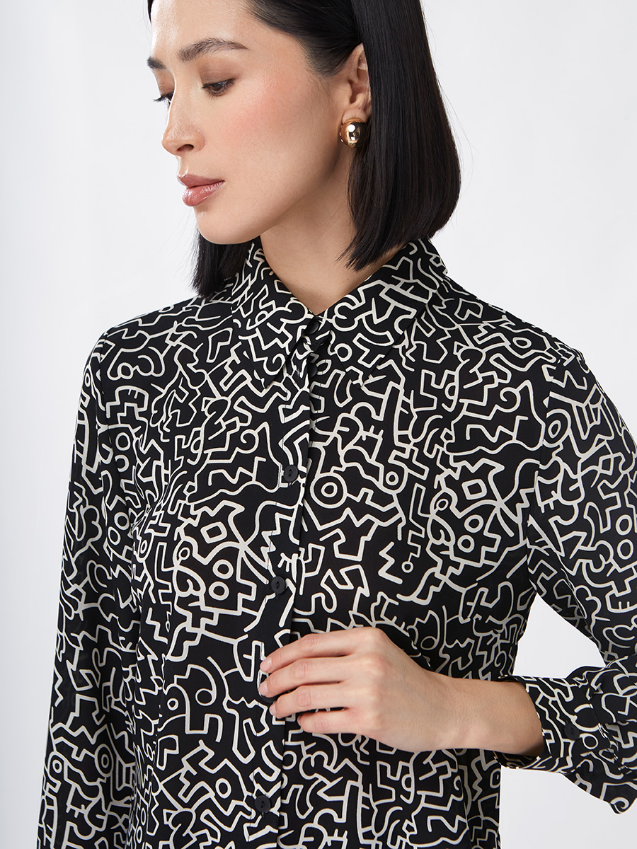 Блузка из принтованной атласной и ткани шифон. Прямого силуэта. Рубашечный воротник на стойке с планкой. Рукав втачной длинный на манжете. Застежка на петли и пуговицы.Рост модели 170 см. Изделие на модели 42 р-ра. Длина изделия по спинке 62 см. Деликатная стирка при 30 градусах.