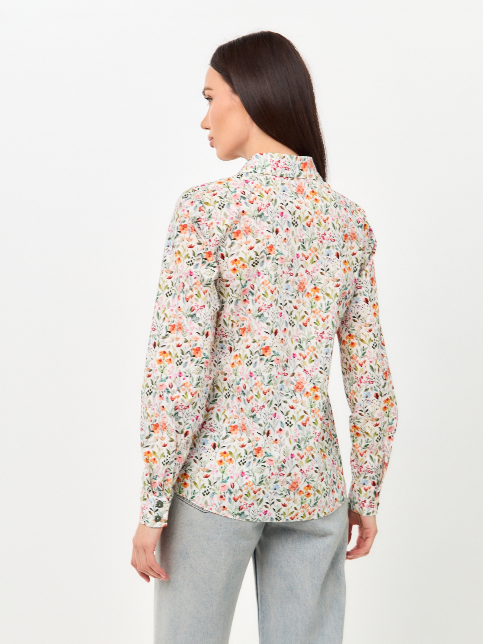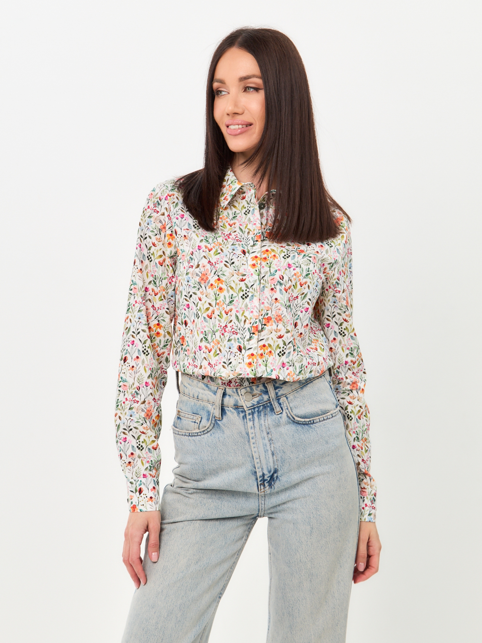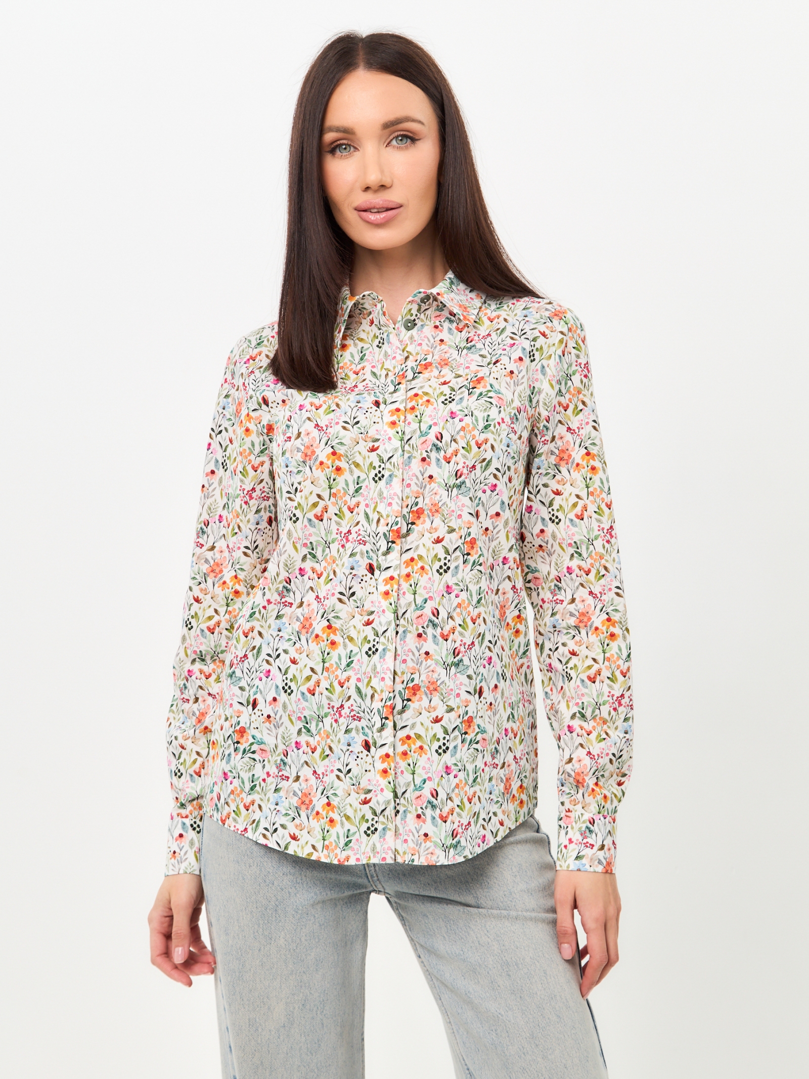 Блузка из хлопка и из штапеля с цветочным принтом. Прямой силуэт с разрезами по боковым швам. Рубашечный воротник на стойке с планкой. Рукав втачной, длинный на манжете. Супатная застежка на петли и пуговицы. Стойка воротника выполнена из контрастной ткани. Рост модели 170 см. Изделие на модели 42 р-ра. Длина изделия по спинке 65 см.