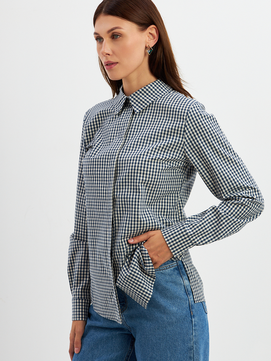 Блузка из хлопка Прямой силуэт с разрезами по боковым швам. Рубашечный воротник на стойке с планкой. Рукав втачной, длинный на манжете. Супатная застежка на петли и пуговицы. Стойка воротника выполнена из контрастной ткани. Рост модели 170 см. Изделие на модели 42 р-ра. Длина изделия по спинке 65 см.
