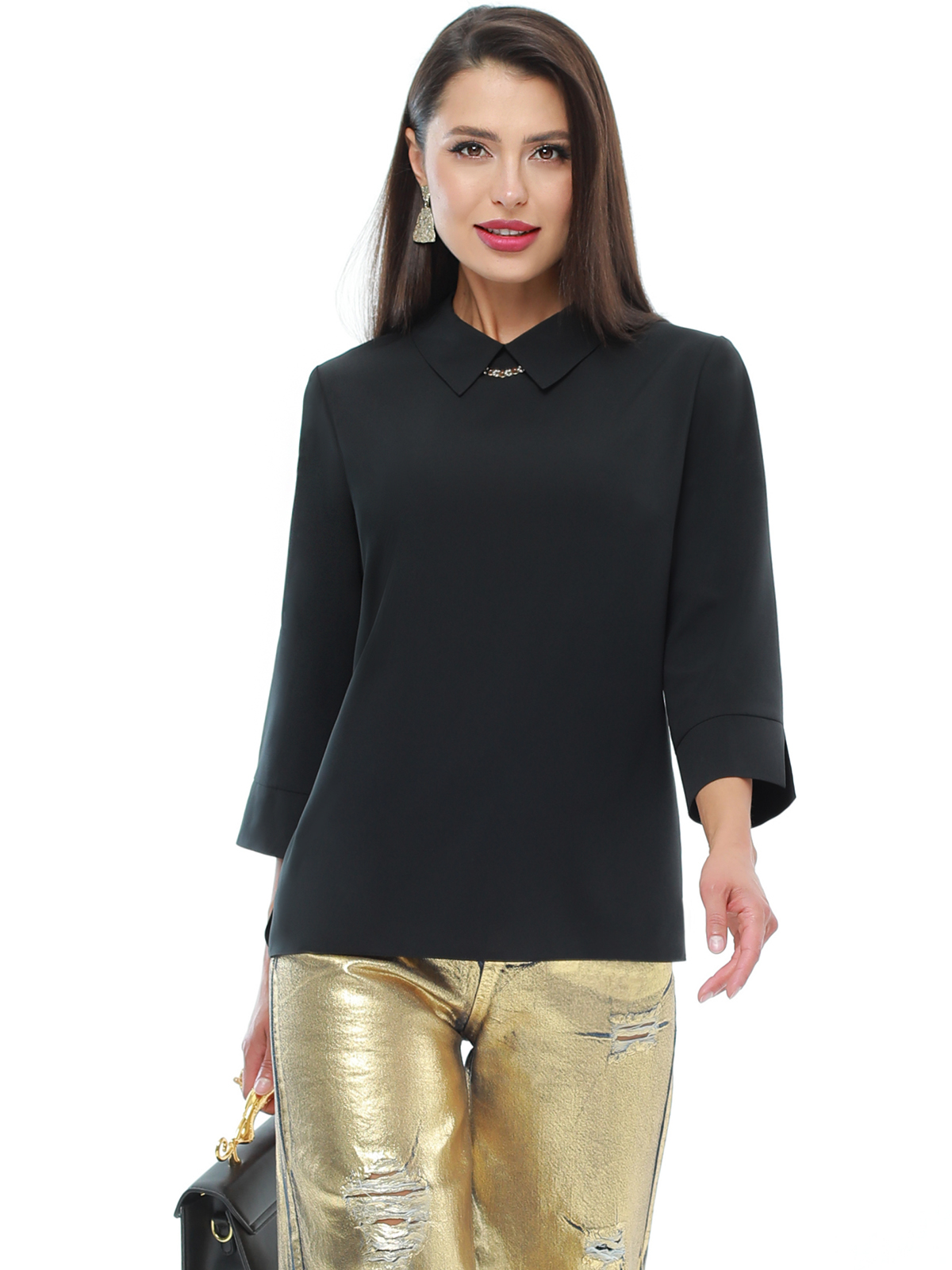 Лаконичная блузка, которая заменит классическую рубашку. Отложной воротничок симметричен как спереди, так и сзади — на спине он оформляет застежку на пуговицу. Манжеты с разрезом на рукавах по стилю гармонируют с воротничком. Прекрасный вариант для делового или нарядного образа.
