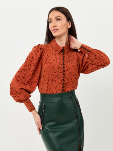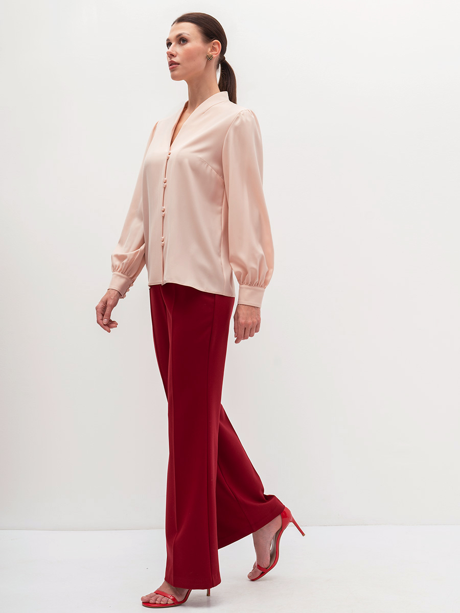 Блузка прямого силуэта. Из однотонной блузочной ткани. Воротник-стойка с V-образным вырезом.Рукав втачной, длинный со сборкой по плечу и по низу, на манжете. Застежка на навесные петли и пуговицы на ножке. Рост модели 170 см. Изделие на модели 42 р-ра. Длина изделия по спинке 63 см.
