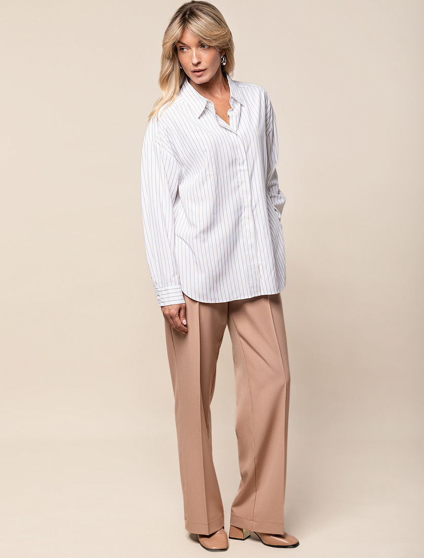 Блузка прямого силуэта с кругленным низом как у рубашки выполнена из премиальной вискозы. Лаконичная модель со спущенной линией плеча и застежкой на потайные пуговицы хорошо впишется в деловые образы с классическими брюками. Или в расслабленном аутфите с джинсами и кроссовками. Материал изделия обладает особой прочностью при этом легкий и маломнущийся. 55%Вис 45%ПЭ