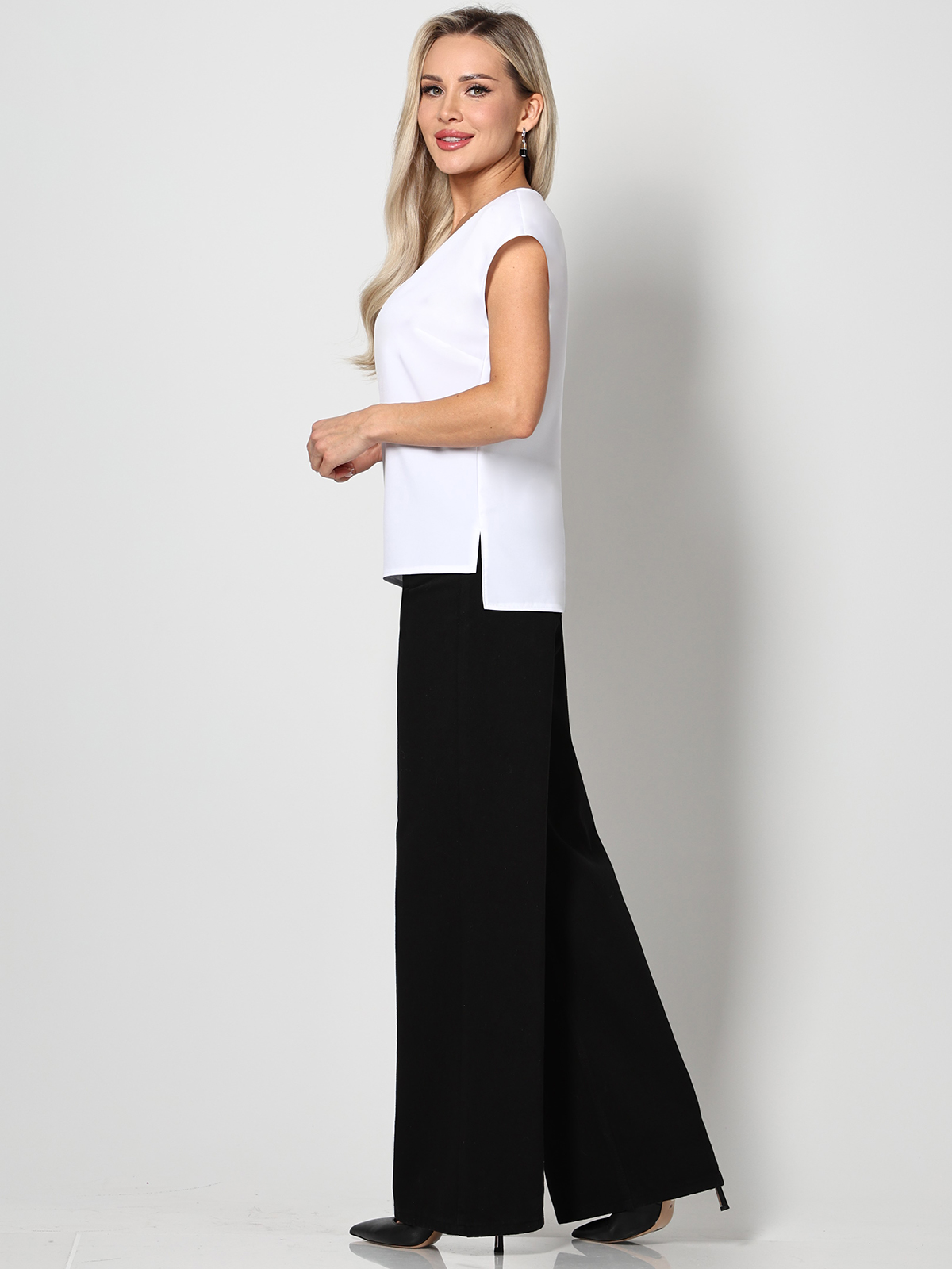 Утонченная блузка с коротким рукавом — базовая модель, которая с легкостью впишется в повседневные, деловые и вечерние образы. Прямой фасон с округлым вырезом, небольшими разрезами по бокам и слегка удлиненной спинкой прекрасно смотрится на женщинах любой комплекции и позволяет чувствовать себя комфортно. Короткие цельнокроеные рукава добавляют образу легкости и оригинальности. Модель выполнена из легкого, приятного к телу материала, который не просвечивает, слегка тянется и эффектно струится в движении. Несмотря на то, что качественная ткань хорошо переносит стирку и не выцветает, рекомендуется стирать блузку в деликатном режиме при температуре не более 30 градусов.