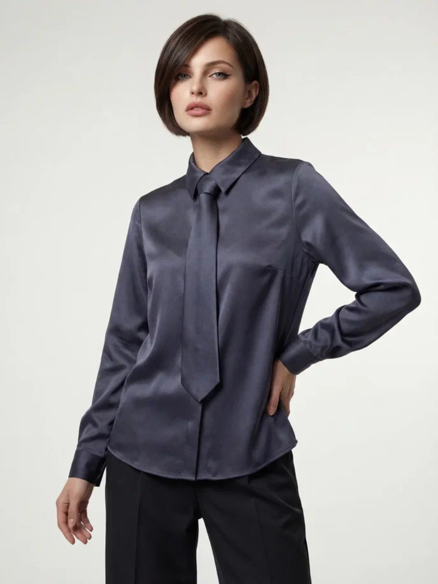 Представляем элегантную блузку с галстуком в благородном графитовом цвете – идеальное дополнение к ассортименту вашего бутика. Модель для ценителей безупречного стиля и качества.Преимущества для ваших клиентов:Изысканный дизайн: Классический крой с интегрированным галстуком, добавляющим образу утонченности и динамичности.Высококачественная ткань: Струящийся материал с деликатным блеском, прекрасно драпируется, комфортен в носке и придает изделию роскошный вид.Универсальность: Легко вписывается в деловой дресс-код, вечерние или праздничные ансамбли. Отлично сочетается с брюками, юбками, жакетами.Превосходные лекала: Внимание к посадке обеспечивает идеальное прилегание по фигуре, подчеркивая достоинства и свободу движений.Как производитель полного цикла, TANTINO гарантирует стабильное качество. Эта блузка — хит продаж благодаря актуальности и универсальности. Предлагая ее, вы пополняете ассортимент эксклюзивными моделями, отличающими ваш бизнес и гарантирующими высокую маржинальность.Приобретайте оптом модные решения TANTINO, разработанные и произведенные в России, удовлетворяя запросы самых требовательных покупательниц.