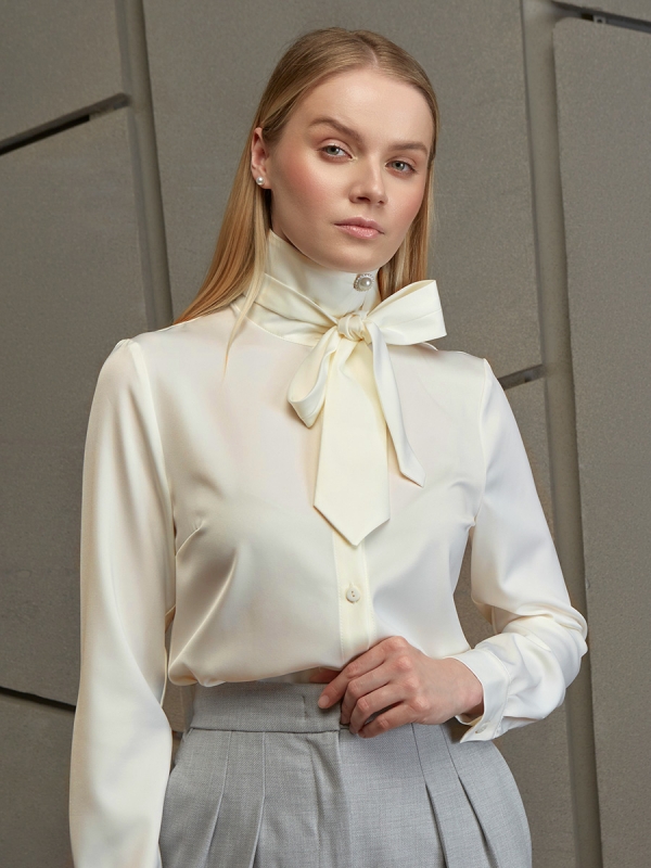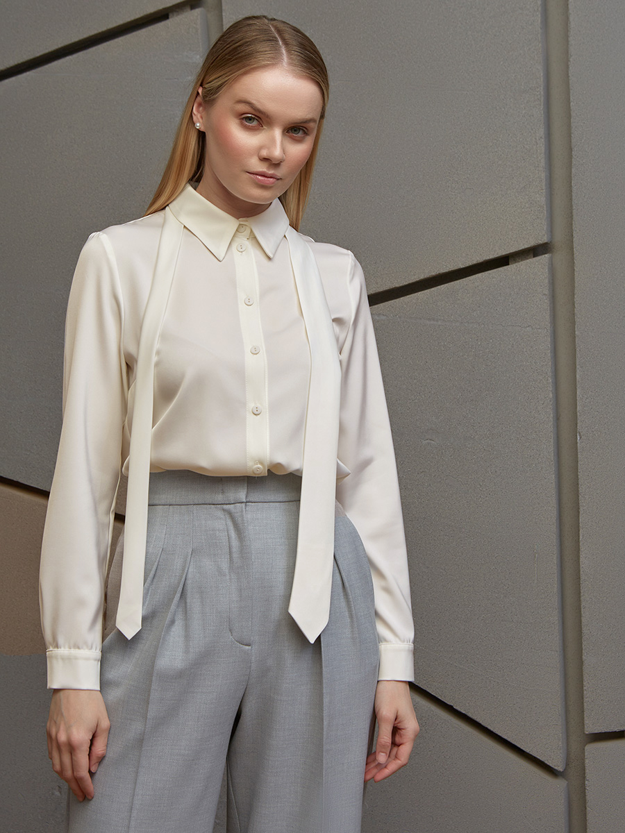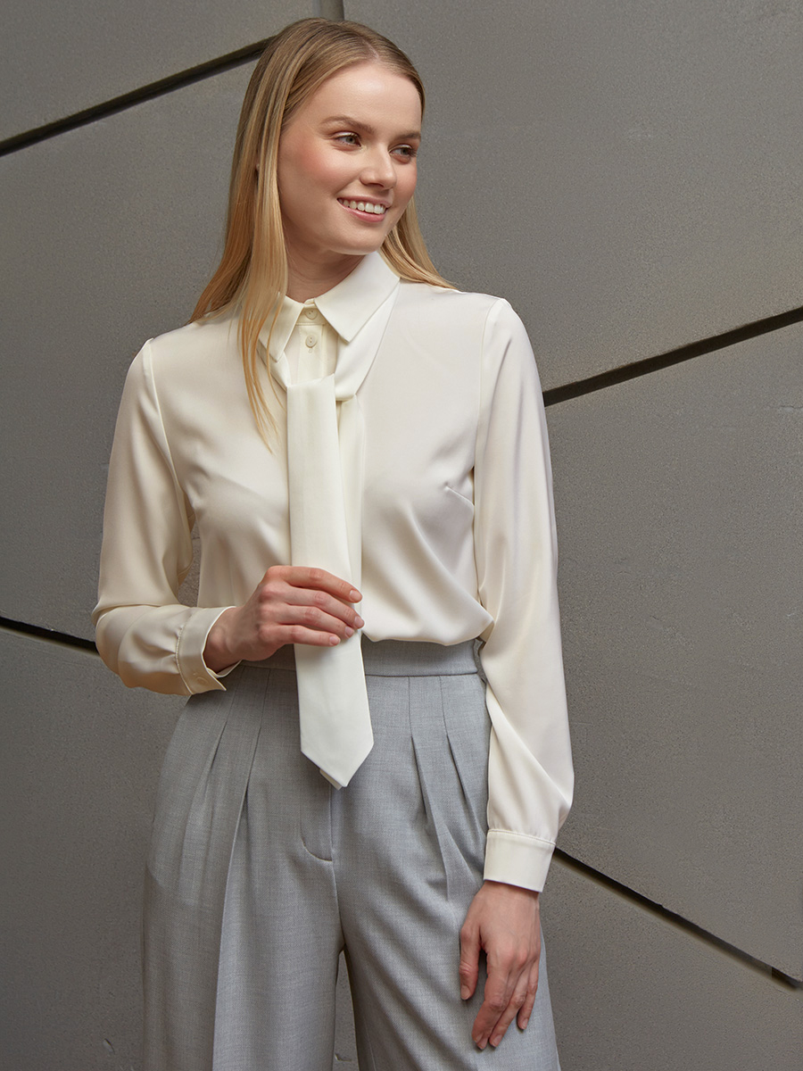 Блузка из однотонной блузочной ткани. Прямого силуэта. Рубашечный воротник на стойке с планкой. Рукав втачной длинный на манжете. Застежка на петли и пуговицы. В комплект входит галстук из основной ткани. Рост модели 170 см. Изделие на модели 42 р-ра. Длина изделия по спинке 62.9 см. Деликатная стирка при 30 градусах.