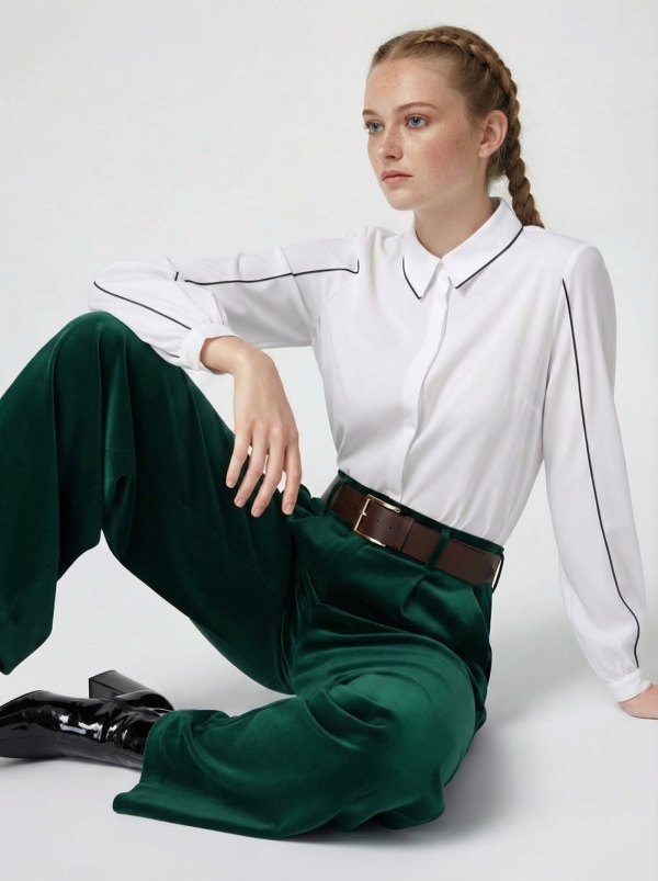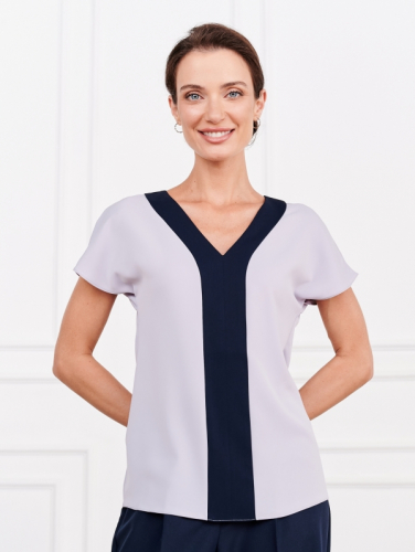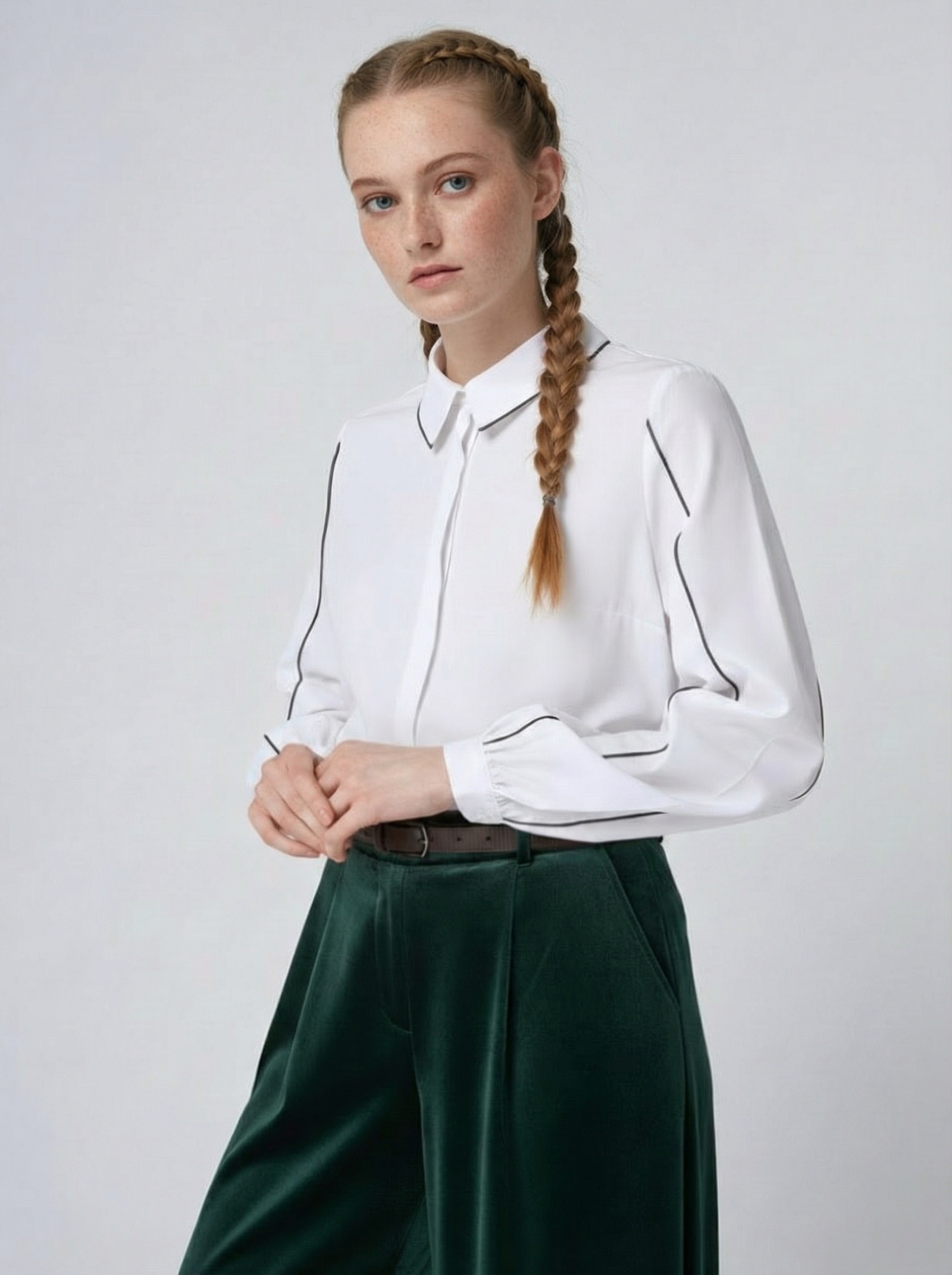 Блузка из однотонной блузочной ткани. Прямого силуэта. Рубашечный воротник на стойке. Супатная застежка на петли и пуговицы. Рукав втачной, длинный со сборкой на манжете. Декоративная контрастная строчка на воротнике и по длине рукава. Рост модели 170 см. Изделие на модели 42 р-ра. Длина изделия по спинке 65 см.