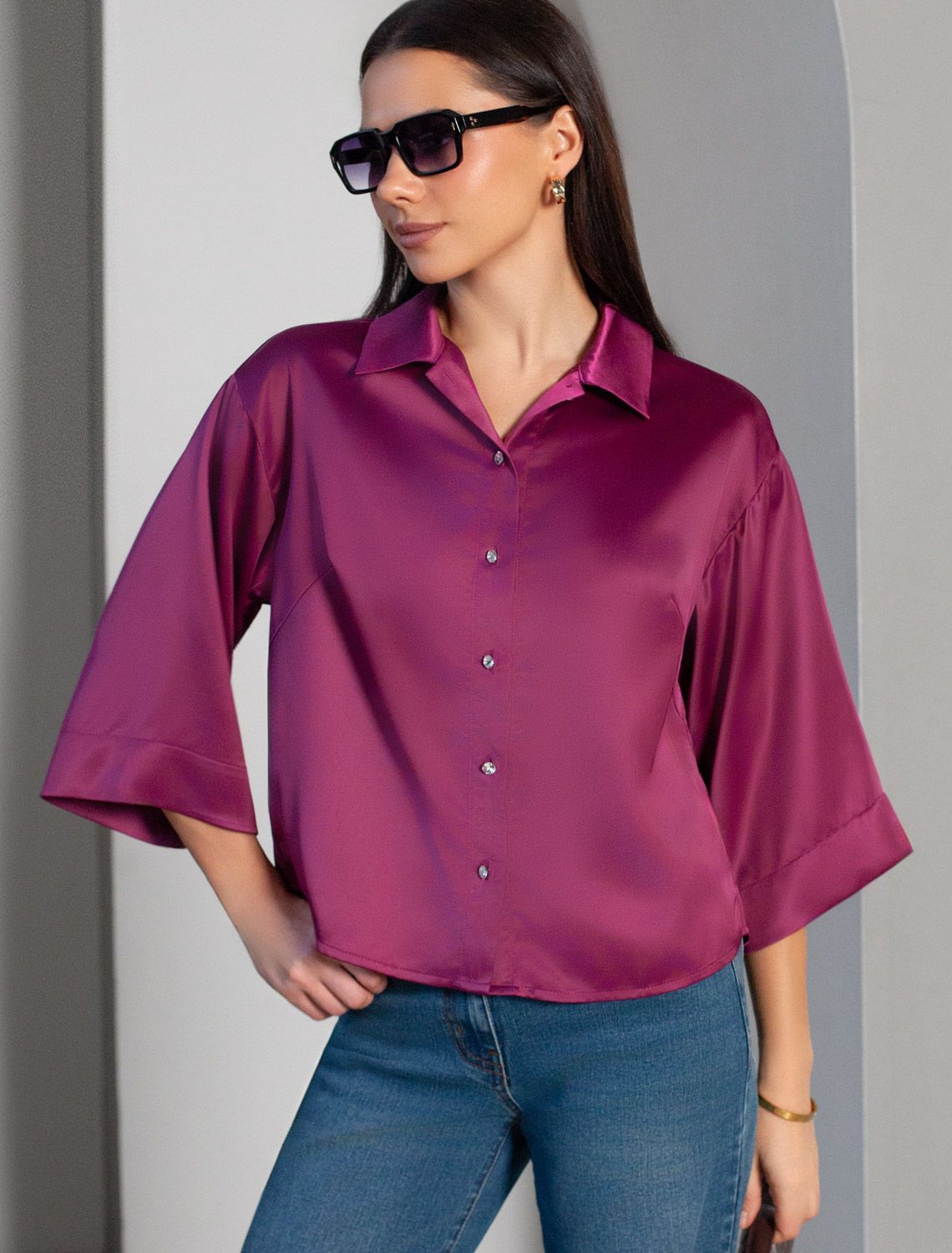 Элегантная блузка цвета бургунди на пуговицах выполнена из плотного струящегося сатина, который мягко ложится по фигуре и создает эффектную посадку. Отложной воротник придает образу женственную и изящную нотку. Материал отличается дышащей структурой, благодаря чему комфорт сохраняется даже в течение всего дня. Широкие рукава обеспечивают свободу движений и подходят для полных рук, делая блузку универсальной для разных типов фигур, в том числе для больших размеров. Красивая гладкая фактура материала подчеркивает утонченность изделия, добавляя легкое сияние к любому образу. Благодаря продуманному крою эта рубашка смотрится стильно как в повседневной жизни, так и на особых мероприятиях. Ткань практична, она приятна на ощупь, легко ухаживается и долго сохраняет первоначальный вид даже после многократных стирок и активной носки.
