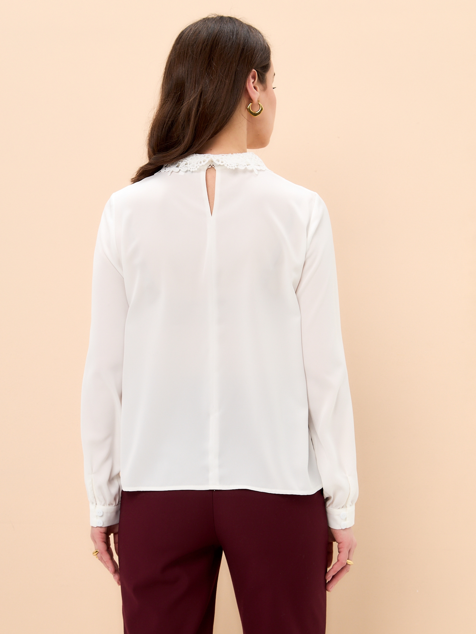 Блузка прямого силуэта из однотонной блузочной ткани. Воротник двойной, отложной из основной ткани и кружевной в цвет. Застежка по спинке на пуговицы. Рукав втачной, длинный со сборкой на манжете. На полочке декоративные отстроченные защипы. Рост модели 170 см. Изделие на модели 42 р-ра. Длина изделия по спинке 58,3 см.