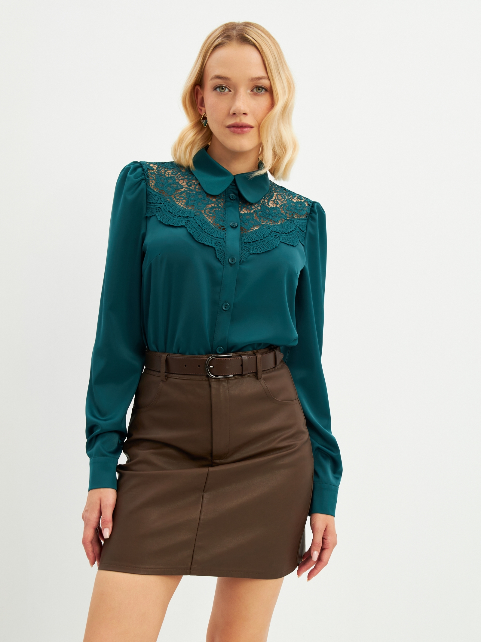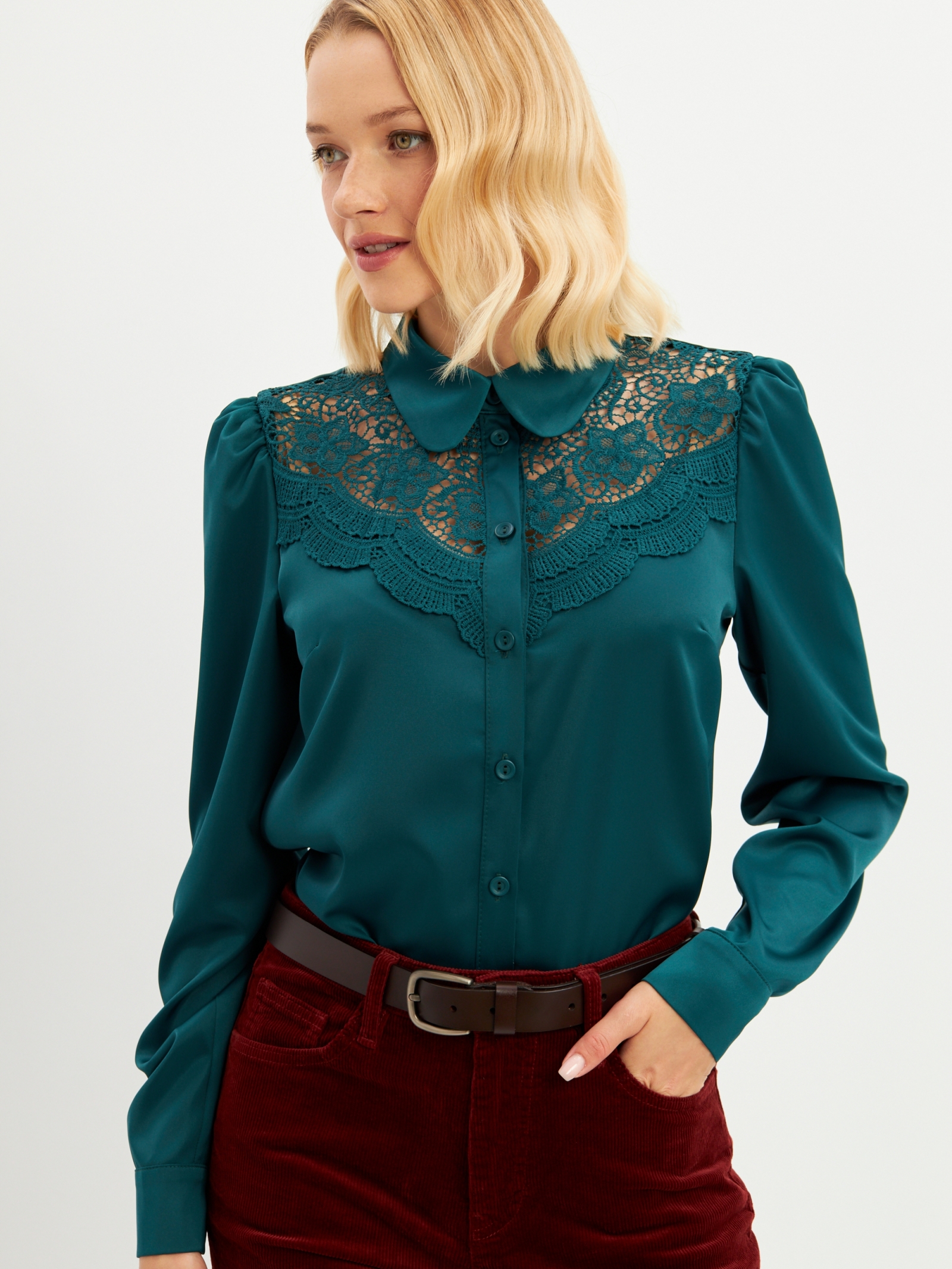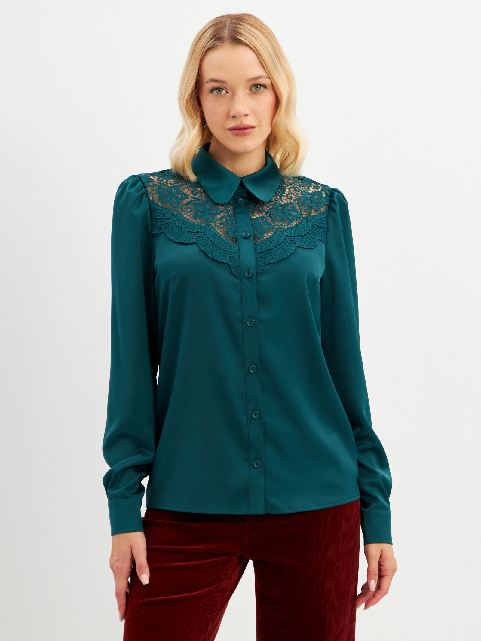 Блузка из однотонной ткани. Рубашечный воротник на стойке. Рукав втачной со сборкой по плечу и по манжете. На полочке декоративная вставка из кружева. Застежка на петли и пуговицы. Рост модели 170 см. Изделие на модели 42 р-ра. Длина изделия по спинке 62.5 см. Деликатная стирка при 30 градусах.