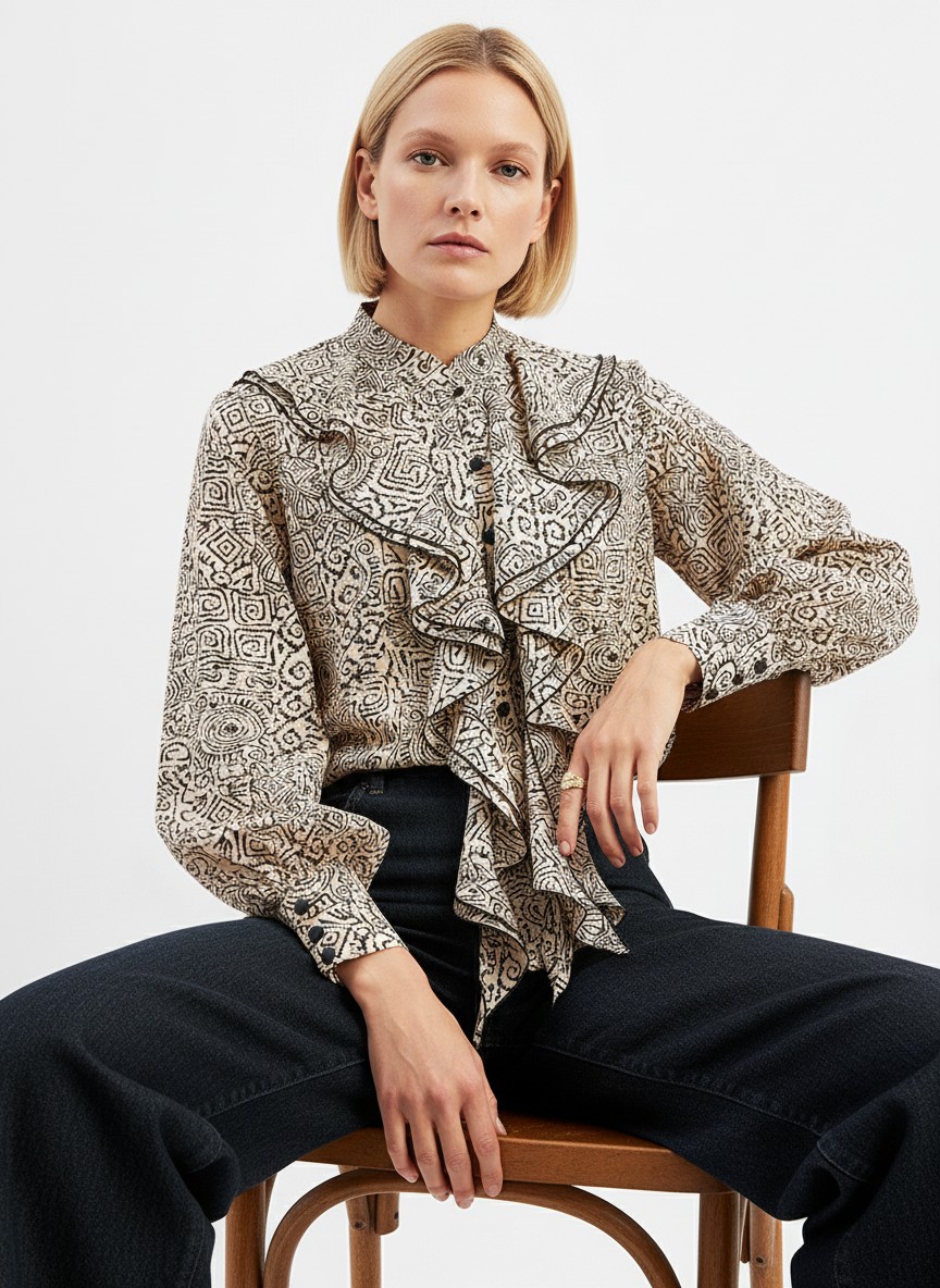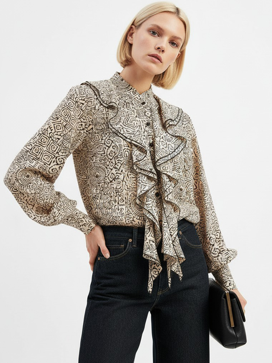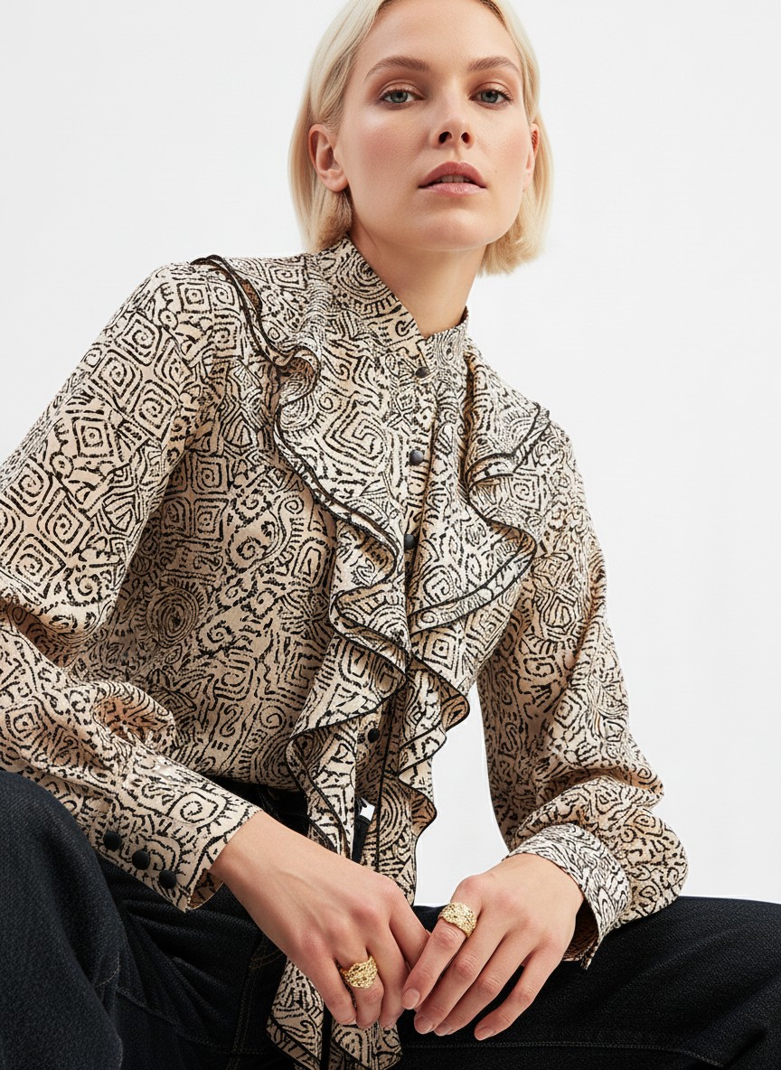 Блузка с отлетными рюшами OD-914-5 бежевый с черным