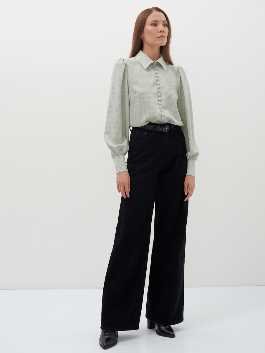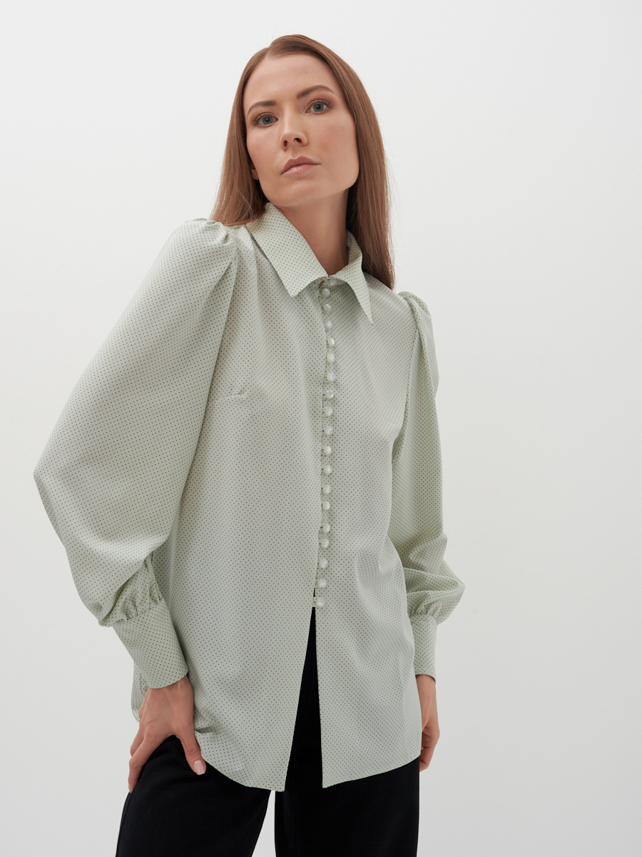 Стильная женская рубашка классического кроя с элементами романтики. Рубашечный воротник на стойке, с застежкой на навесные петли и пуговицы, освежает образ делая его более нарядным и интересным. Длинный рукав на манжете со сборкой и сборкой по плечу, создает эффект фонарика, добавляя легкости и подчеркивая женственность и утонченность. Такая рубашка органично впишется в повседневный, деловой или нарядный лук.