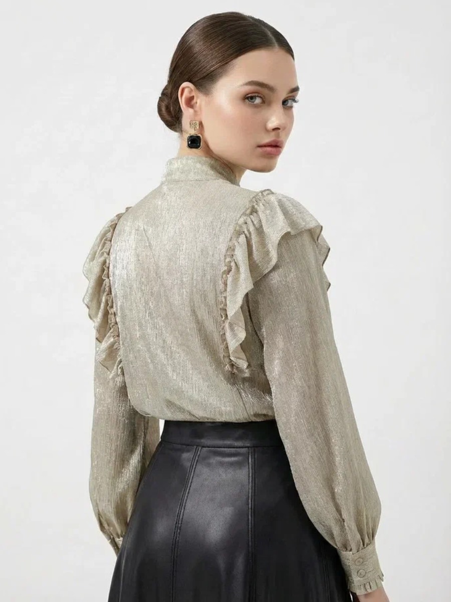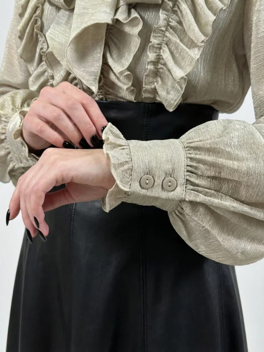 Блузка из однотонной фактурной ткани с деликатным блеском. Модель прямого силуэта. Горловина оформлена в виде воротника-стойки с элегантными завязками. Рукав втачной, длинный, на резинке и дополнен нежным воланом. На полочке и спинке настрочены декоративные рюши. Застежка выполнена на петли и пуговицы. Состав: 100% полиэстер. Основной материал: блузочная, органза. Стиль: романтический, нарядный. Длина изделия по спинке: 64 см. Рекомендации по уходу: деликатная стирка при 30 градусах. Рост модели 170 см. Изделие на модели 42 размера.