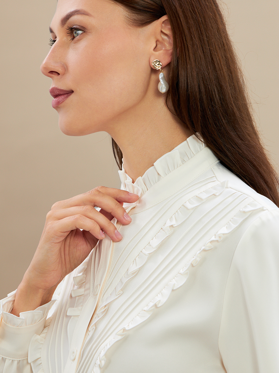 Блузка из однотонной ткани. Воротник-стойка с рюшей. Рукав втачной, длинный на манжете со сборкой. По полочке декоративные рюши и зашипы. Прямой силуэт. Застежка на петли и пуговицы по планке и манжете рукава. Рост модели 170 см. Изделие на модели 42 р-ра. Длина изделия по спинке 59 см. Деликатная стирка при 30 градусах.