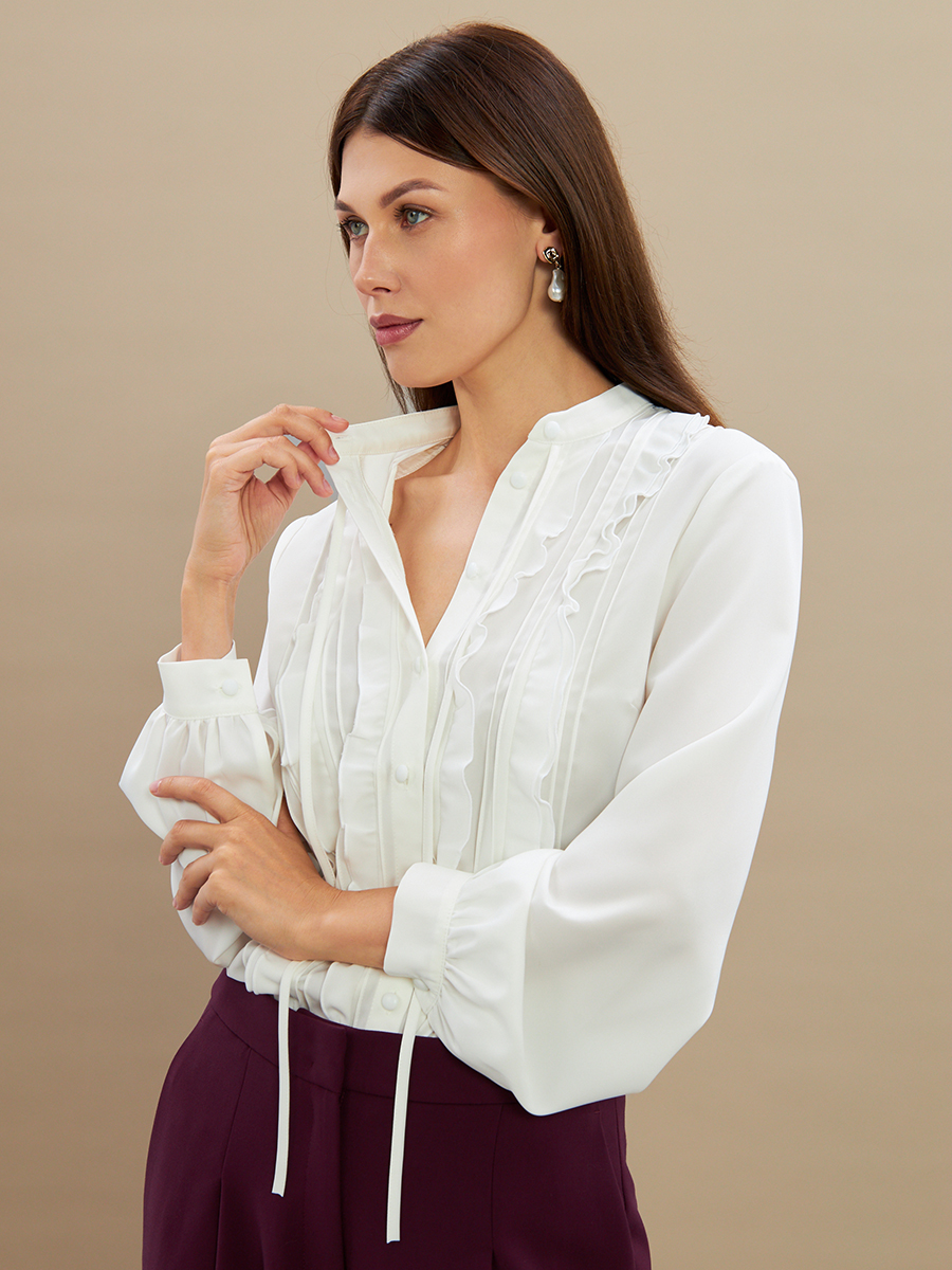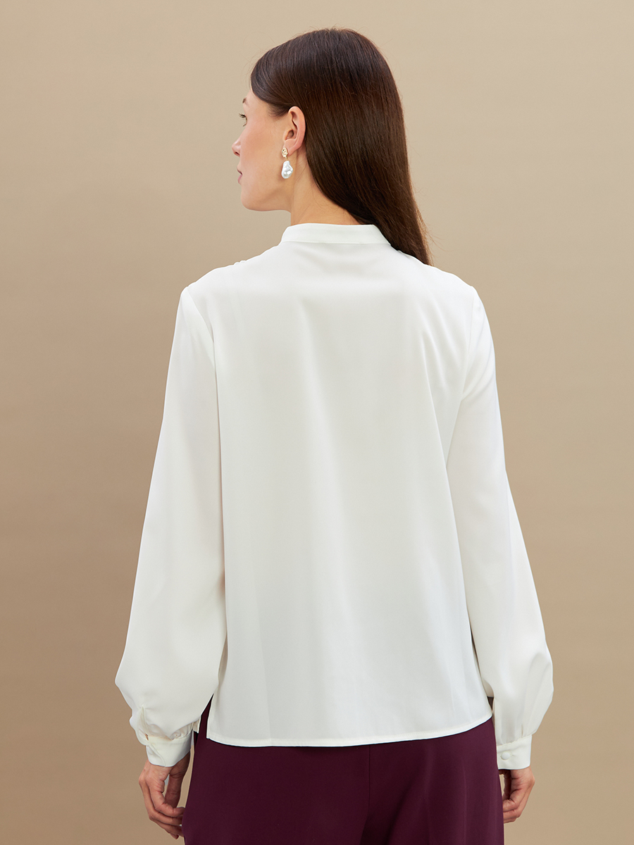Блузка из легкой однотонной ткани. Прямой силуэт. Воротник-стойка. Рукав втачной, длинный на манжете со сборкой. Застежка по центру полочки на пуговицы. Полочка с декоративными элементами: рюши, защипы и завязкой на воротнике. Разрезы в боковых швах изделия. Рост модели 170 см. Изделие на модели 42 р-ра. Длина изделия по спинке 61 см.