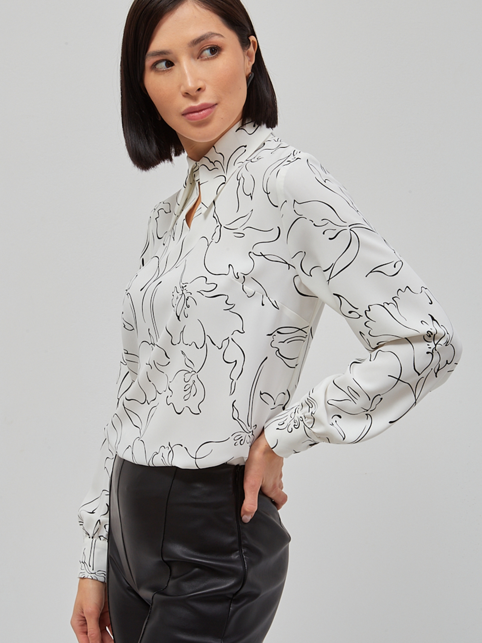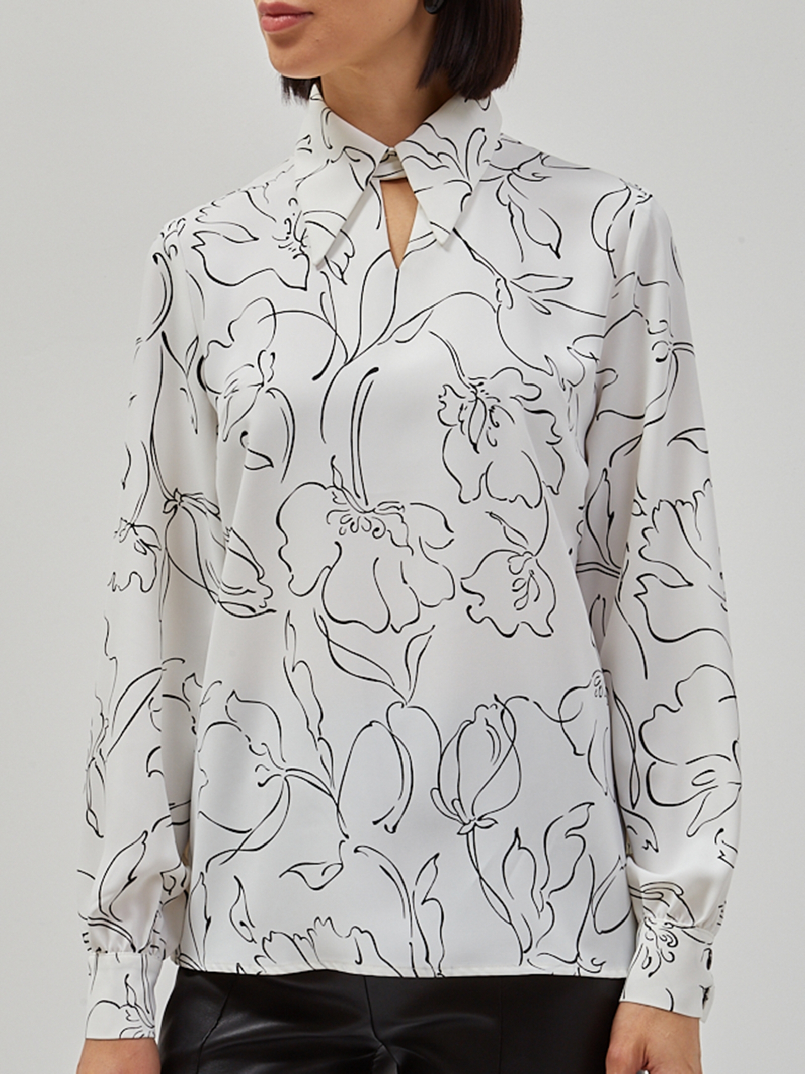 Блузка прямого силуэта. Плательно-блузочная ткань с цветочным принтом. Рубашечный воротник на стойке. Вырез на горловине полочки. Рукав втачной, длинный со сборкой на манжете. Застежка на петли и пуговицы на стойке и манжете. Рост модели 170 см. Изделие на модели 42 р-ра. Длина изделия по спинке 62 см.
