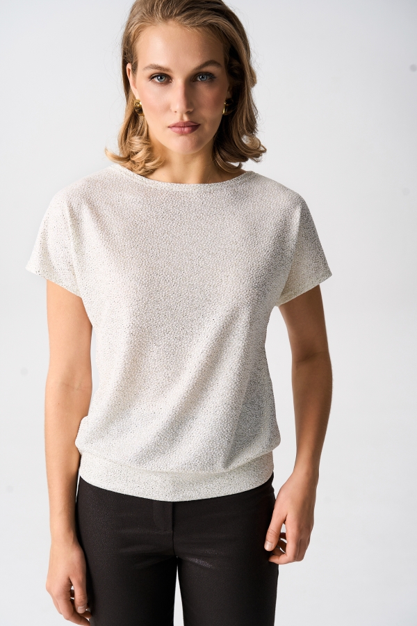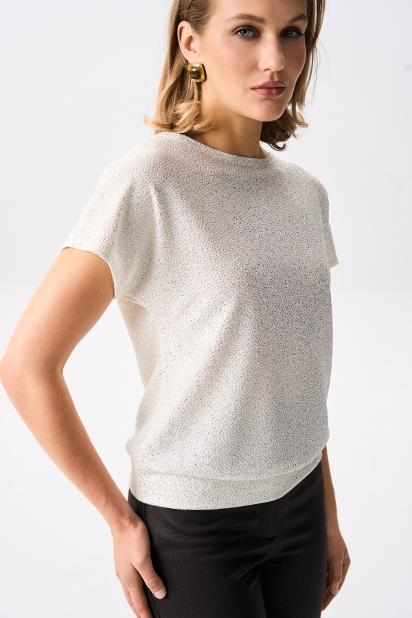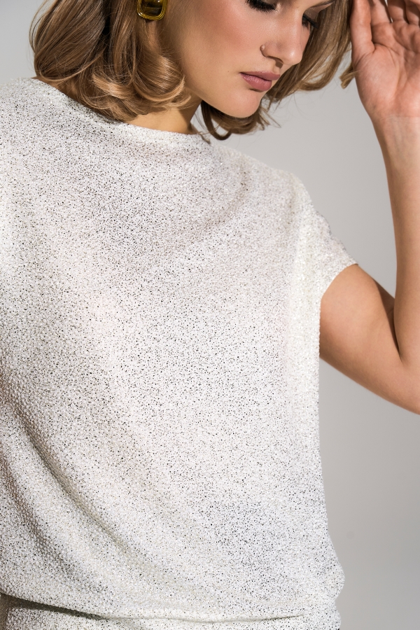 Блуза из мерцающего трикотажа. Модель свободного силуэта на притачном поясе по низу. Горловина лодочка. Рукав спущенный.