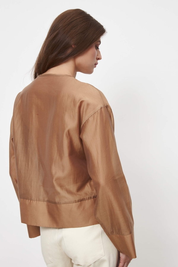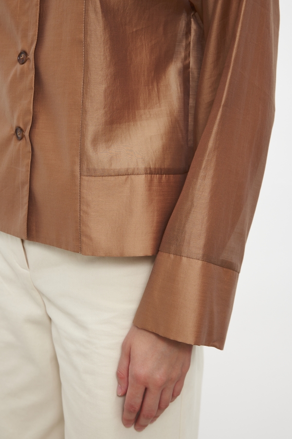 Элегантная блуза из вискозной органзы. Модель свободного силуэта. Спущенная линия плеча. Круглый вырез горловины. Длинный, слегка расклешенный рукав. Застежка на пуговицы.