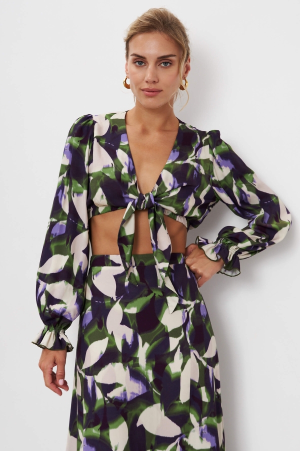 Блуза из высококачественного вискозного полотна с авторским принтом. Укороченная модель с функциональным узлом по переду. Рукав-фонарик со сборкой на резинке.