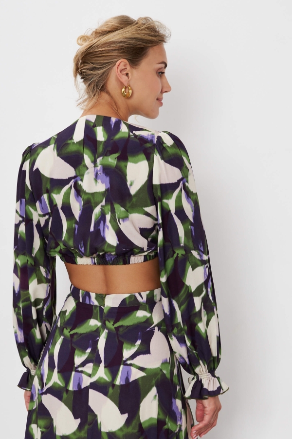Блуза из высококачественного вискозного полотна с авторским принтом. Укороченная модель с функциональным узлом по переду. Рукав-фонарик со сборкой на резинке.
