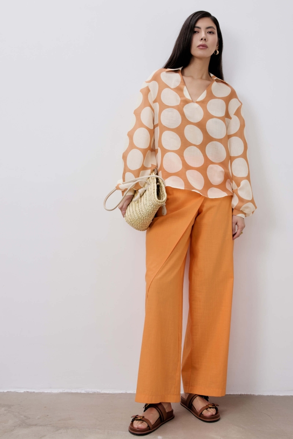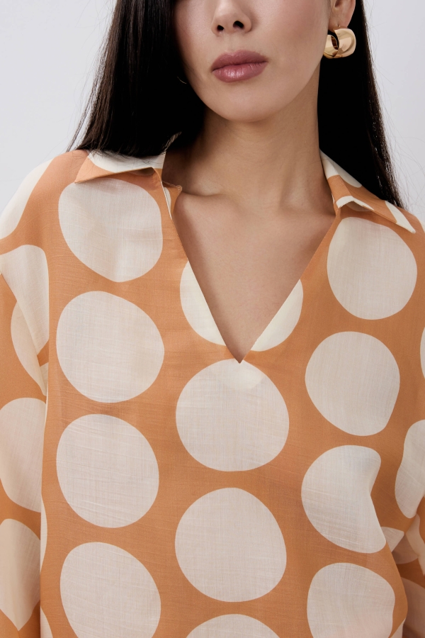 Блуза из воздушной, вискозной органзы-вуаль в трендовом принте. Модель свободного силуэта. По переду отложной воротник с V-вырезом. Рукав спущенный, свободный с манжетой на застежку.