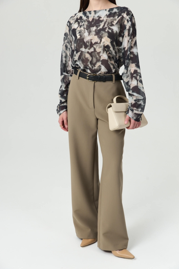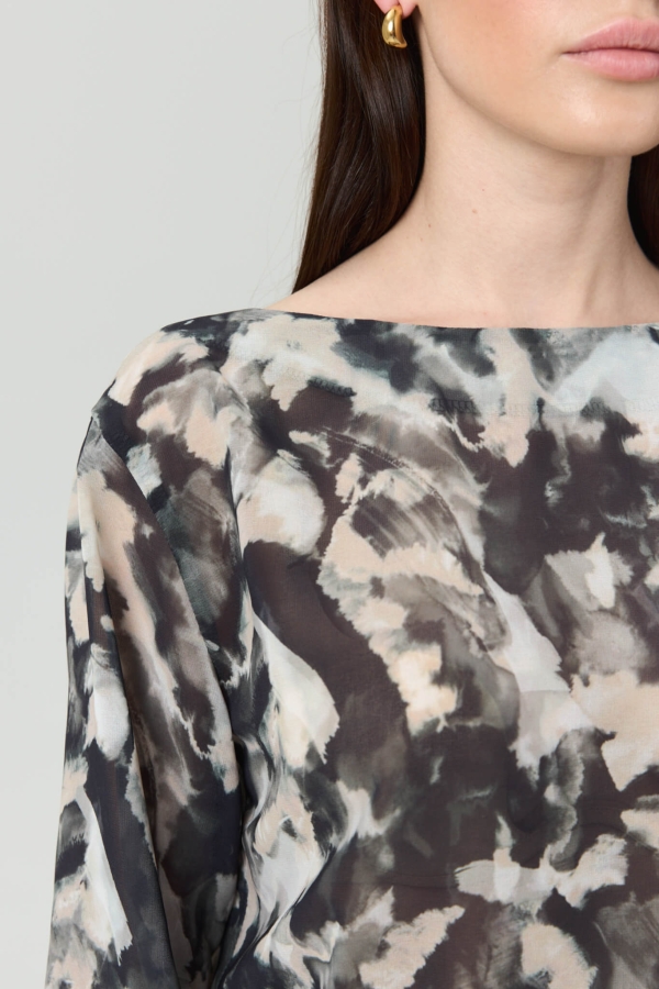 Блуза из шифонового полотна с абстрактным принтом. Блуза прямого силуэта. Вырез горловины - “лодочка”. Линия плеча слегка спущена, по нижней части рукава заложены декоративные складки.